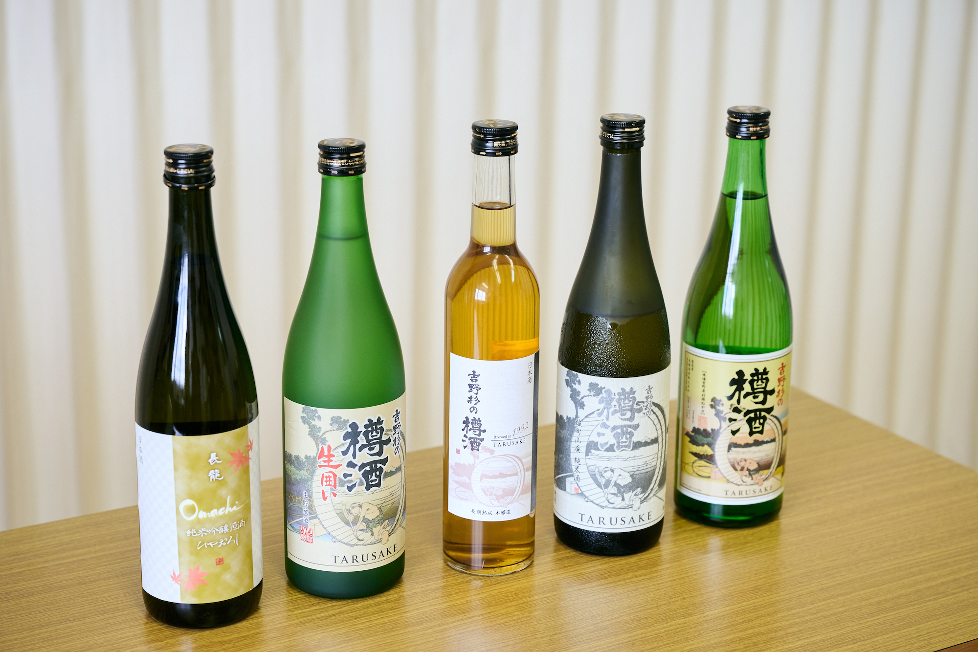 左から:雄町 純米吟醸 原酒 ひやおろし / 吉野杉の樽酒 生囲い / 吉野杉の樽酒 長期熟成 本醸造 1992/ 吉野杉の樽酒 雄町山廃純米酒 / 吉野杉の樽酒