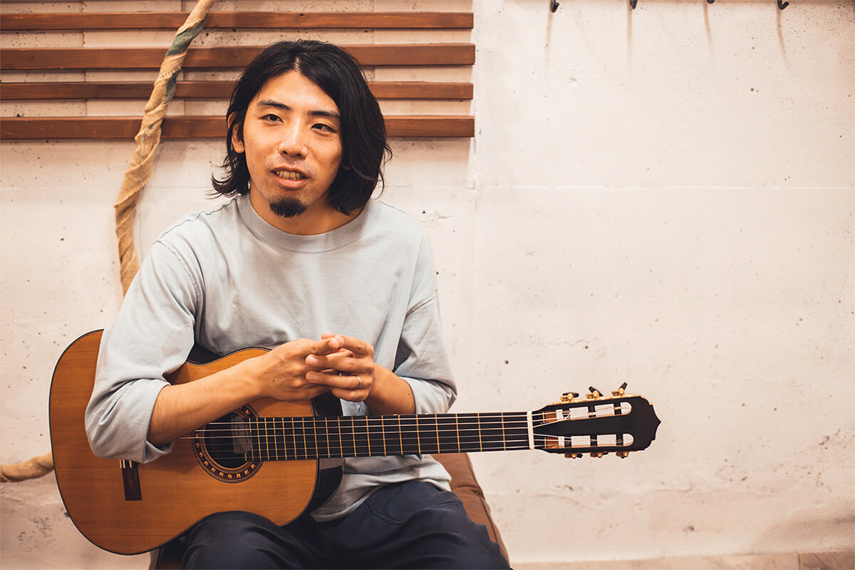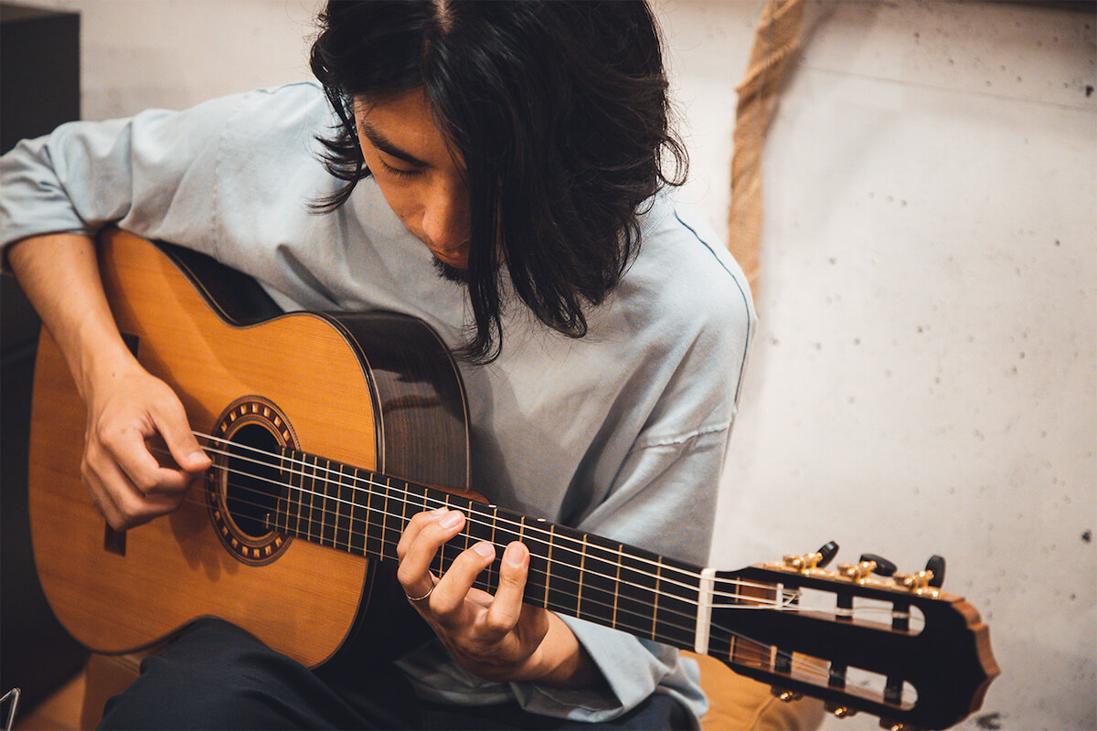 そこで今回は、ギタリストの関ロシンゴさんにこの吉野杉クラシックギターを試奏していただきました。関ロさんは、自身のバンドOvallやソロ名義での活動のほか、あいみょんや藤原さくらのプロデュース、米津玄師のニューアルバム『STRAY SHEEP』での客演など、ジャンルを超えた幅広い活動で知られるアーティスト。ここ数年は自身のSNSやYouTubeで定期的にギター演奏を披露、国内外問わず熱心なフォロワーを着実に増やし続けています。