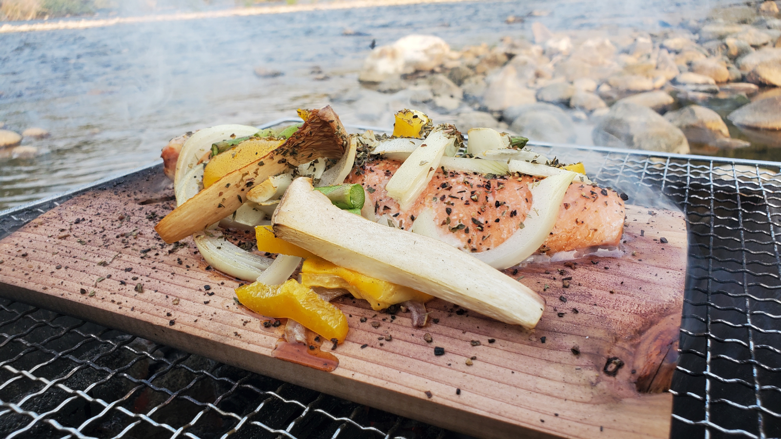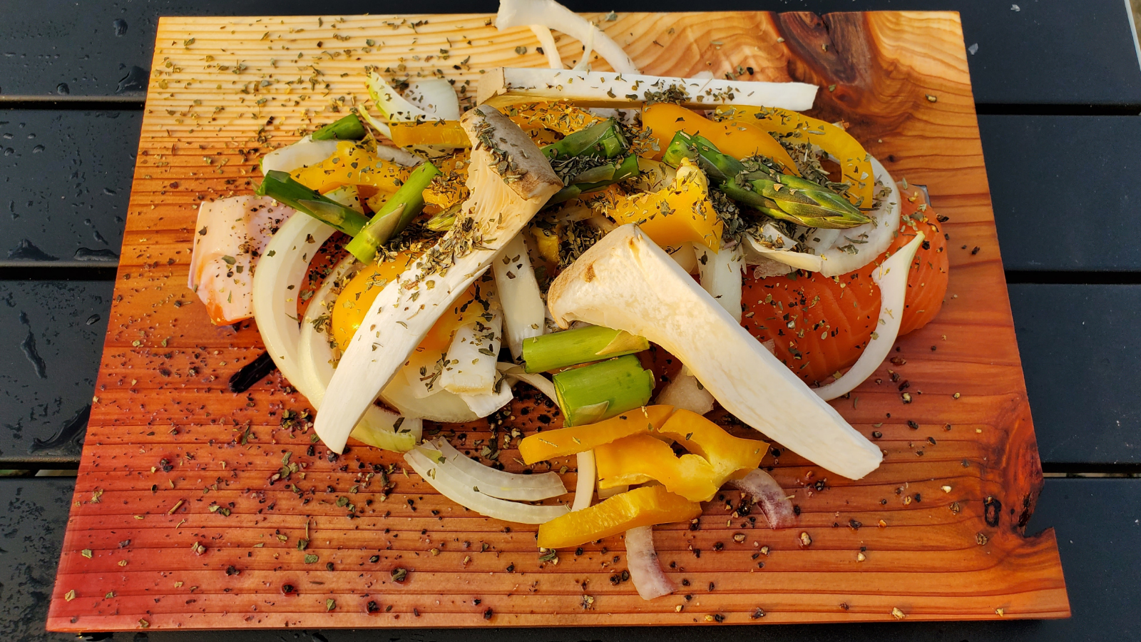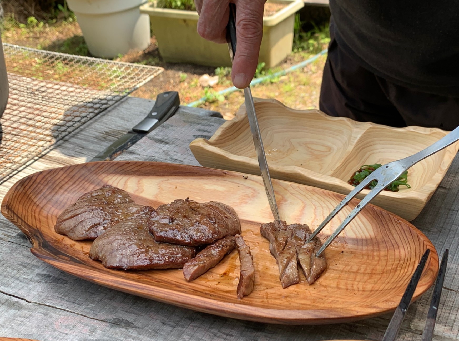 「ウッドプランク」というのは、直訳すると「木の板」という意味ですが、水などに浸した木の板の上に食材を置き、それをグリルなどで火にかけることで、蒸気や煙などで熱を通していく調理に使います。間接的に熱が伝わり、木の香りなどで芳しく仕上がることから、近年、人気が出てきており、アメリカでは定番の調理法です。