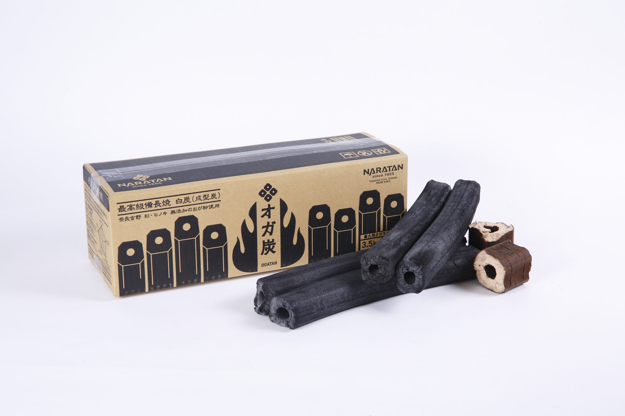 吉野郡大淀町は、吉野の山が近く、良質な木材原料がより多く入手できる土地。優良な奈良の木を原料に開発されたのが、「NARATAN」のアウトドア用木炭「オガ炭」と「オガライト」。吉野桧・吉野杉などの奈良の木を中心としたおがくずを高温度で炭化した「オガ炭」は、炭素純度が高く、長時間燃焼し、灰が少ないことで強い燃焼と遠赤外線を維持できます。そのため、高温で食材を美味しく調理でき、調理後のメンテナンスも簡単に行えます。