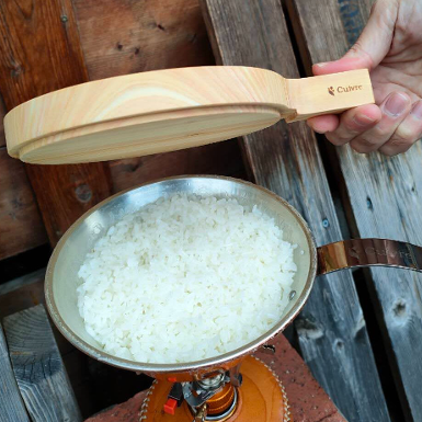 「吉野の伝統と技術を、キャンプギアを通して堪能してもらいたい」という想いが込められたシェラカップ用の蓋「Yoshino Lid(ヨシノ リッド)」。鉄製のものが多いシェラカップ用の蓋ですが、木を用いることであたたかみを持たせるだけでなく、デザイン性もあり、銅製シェラカップとの一体感を感じられます。製造を担う『菊谷木工所』の担当者もキャンプ好きであったことから、作り手側からもアイデアを持ち寄り誕生したこの製品。銅製シェラカップと組み合わせてご飯を炊き上げると、お米の甘みが増し、吉野桧・吉野杉の清々しい香りを楽しむことができる、とユーザーからも高い評価を受けています。使用している奈良の木は、年輪幅が細かく密度が高いため、強度があり、たわみにくい特徴をもっており、キャンプギアとして長く使用することができます。また、木目と色合いが美しく、目でも楽しめることもポイントです。デザインは和・洋あり、模様や使用木材が異なる3種類のラインナップがあるので、好みに合わせて選ぶことができます。