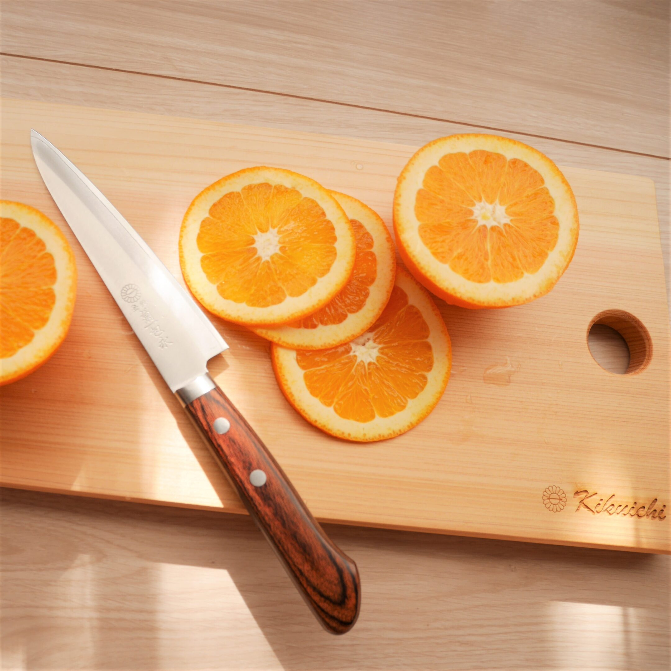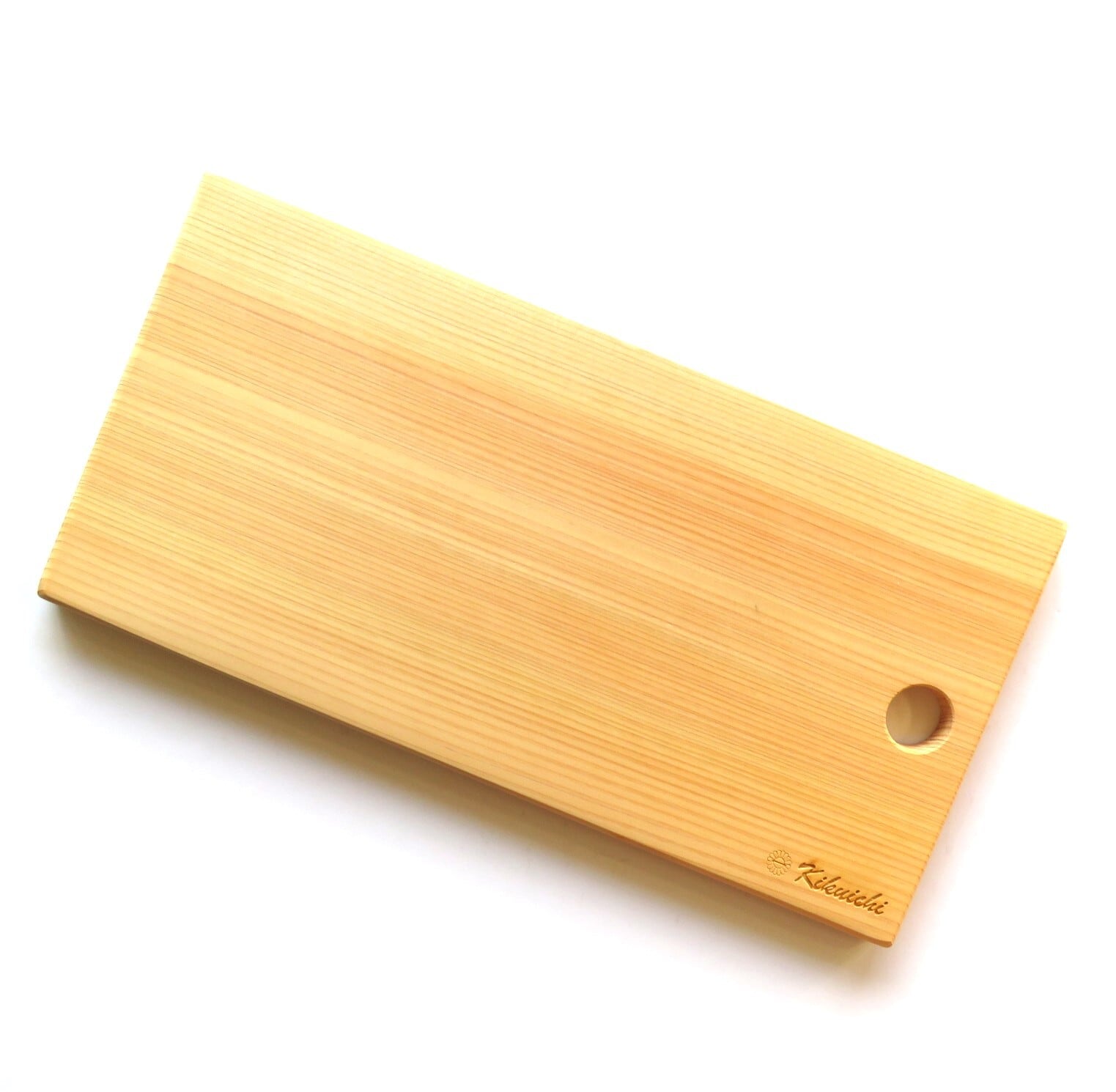 開発にあたって試行錯誤していく中で、優れた抗菌作用と美しい見た目を持つ吉野桧に行き着きましたが、製造を依頼するパートナー探しは難航しました。自ら探したり、材木商店に問い合わせたりしましたが、なかなか「これ!」というパートナーは見つかりませんでした。そんななか、下北山村で製材業や木工業を営む「スカイウッド株式会社」と出会い、製品への丁寧な仕事に惚れ込み、製造をお願いすることに決まりました。奈良市のショッピングセンターで、下北山村の商品PRのためのポップアップショップにスカイウッド株式会社が出展していたことで生まれた偶然の出会いだったのだとか。苦労して開発したカッティングボード。美しいだけではなく、包丁の刃あたりの良さも感じられる仕上がりとなっているのは刃物店だからこそのこだわりです。