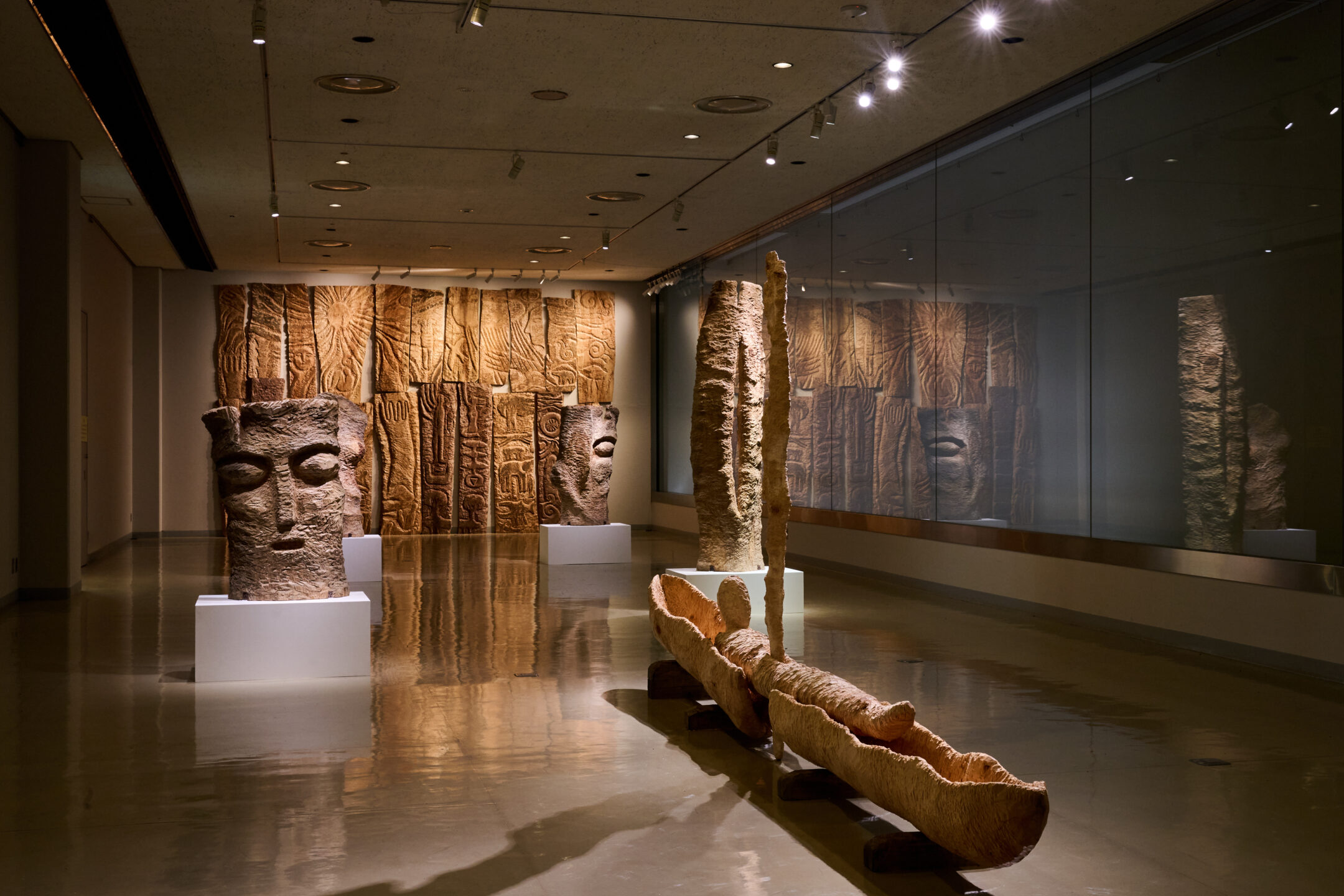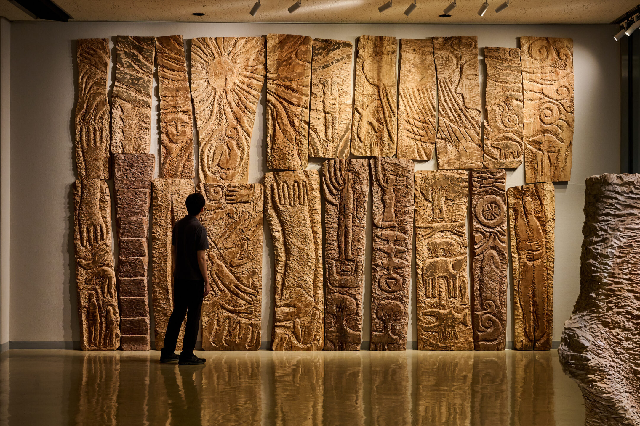 第4展示室「宇宙の理~魂の帰還」の会場です。一度、すべて魂が抜け落ちてしまっていたところに、それぞれの魂が戻ってきた。そのときを、みんなで体験しようよという空間。とくに、一番奥の壁際にある21点組の「魂の帰還」というレリーフは、注目をしていただきたい作品です。その前に立って自分と対話をしていただくのもいいと思います。