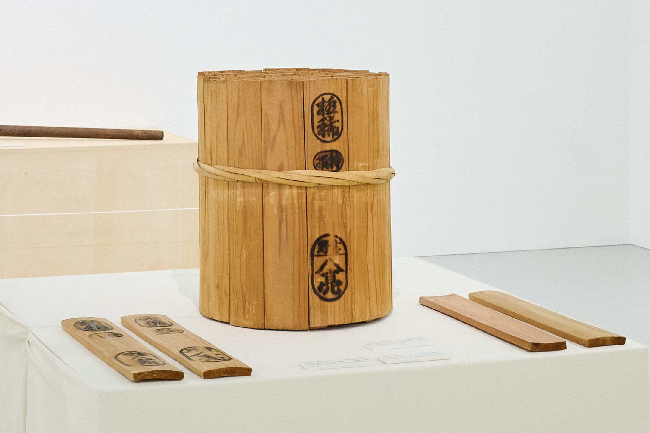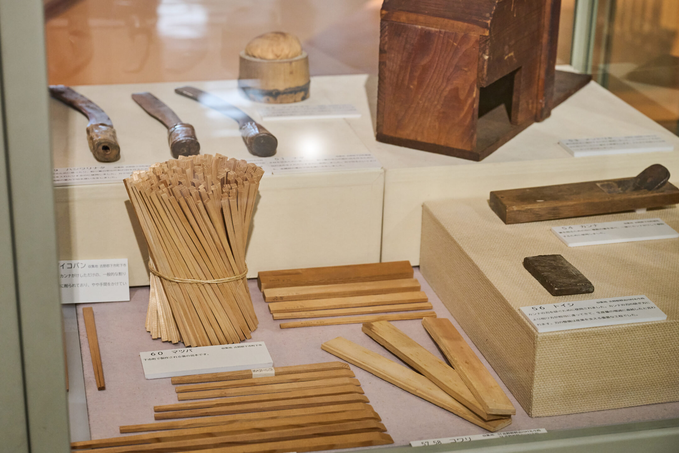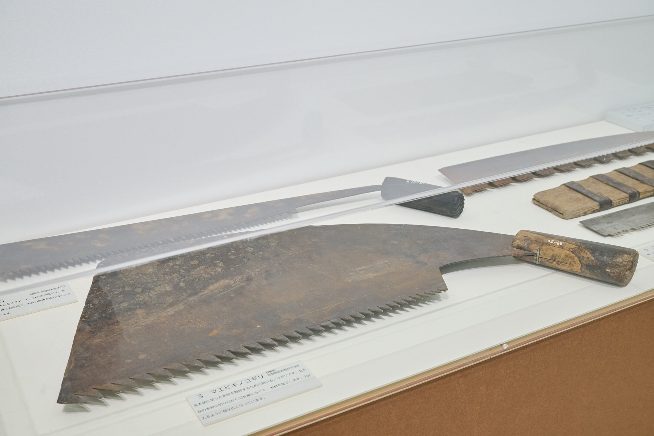 今回の特別展にあわせて、美術館1階では、奈良県立民俗博物館企画のギャラリー展「吉野林業の世界」も開催。木を切り倒す斧やノコギリなどの林業用具だけでなく、吉野林業で発展した酒樽や割り箸などの林産加工用具などの展示品を通して木を利用してきた人間の営みを伝える企画です。同じように見える手作りの道具でも、用途にあわせて違っていたり、繊細で工夫が凝らされていたりする点も見どころです。林業に関わる先人たちが、道具を工夫し、改善し進化を遂げより良い結果を残してきた証に、奈良の木への想が偲ばれます。