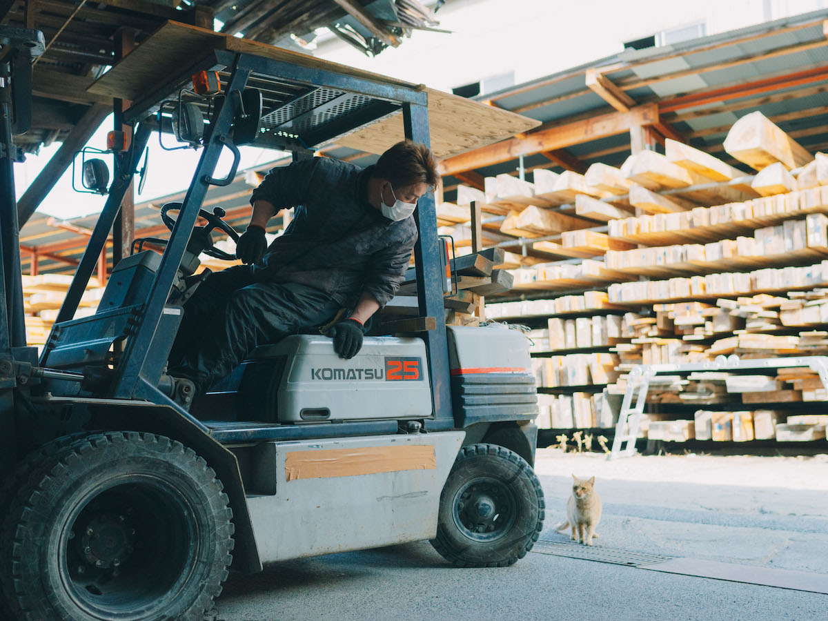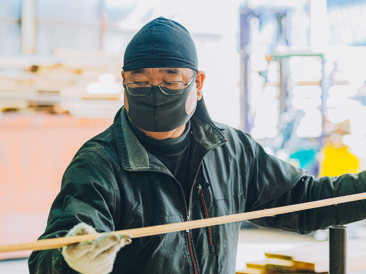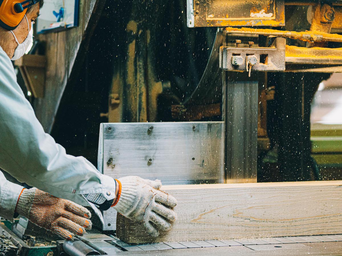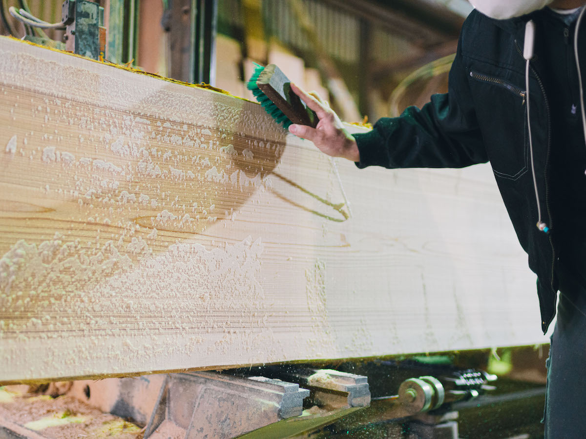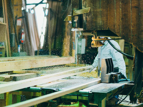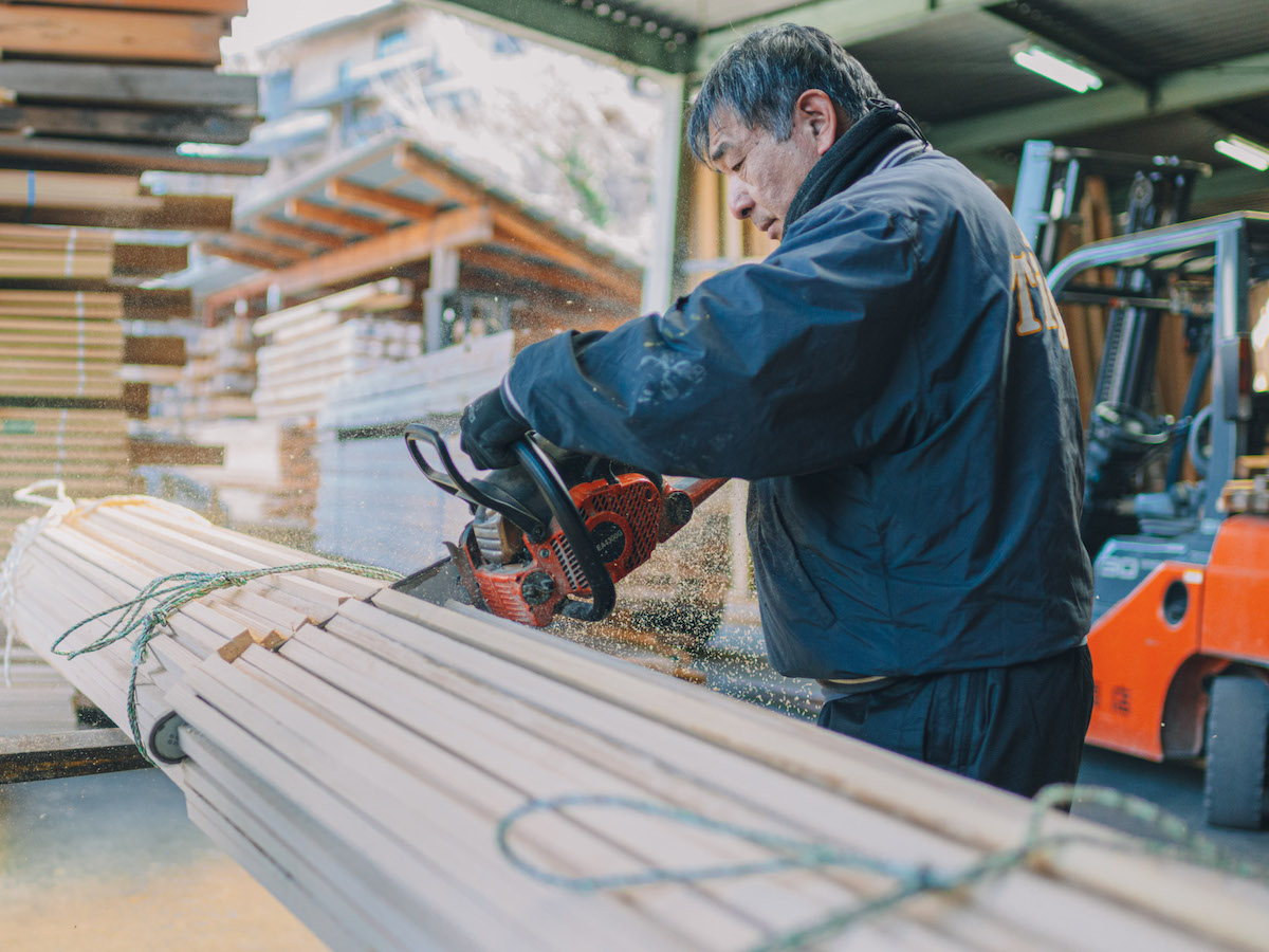 吉野スギを専門に取り扱う製材所『高橋商店』では、直径30〜60cmの丸太から、寺社仏閣や茶室、一般住宅から公共施設などで取り扱う建材を切り出しています。木目や大きさ、それぞれに個性のある原木を、用途にそって均一なものに揃えて切り出すその技術はまさに職人技。