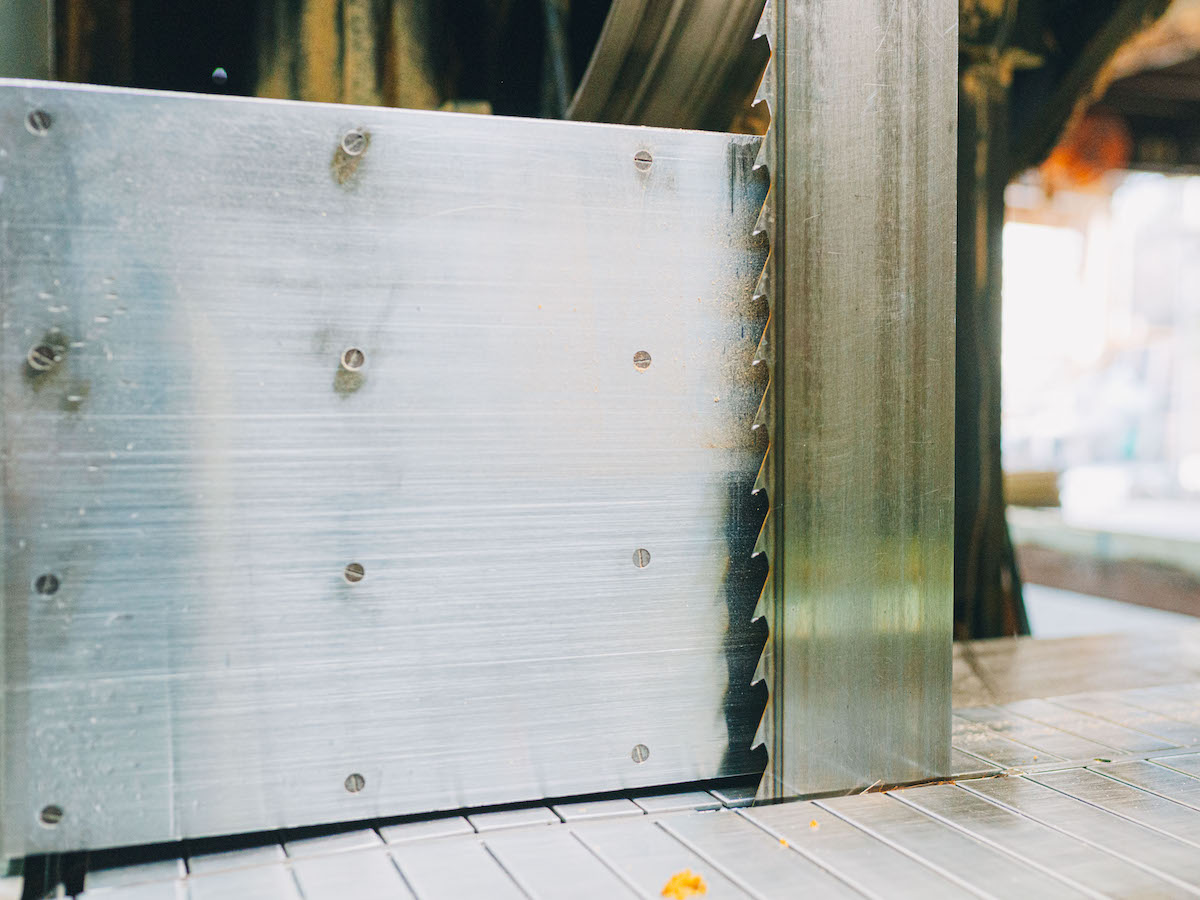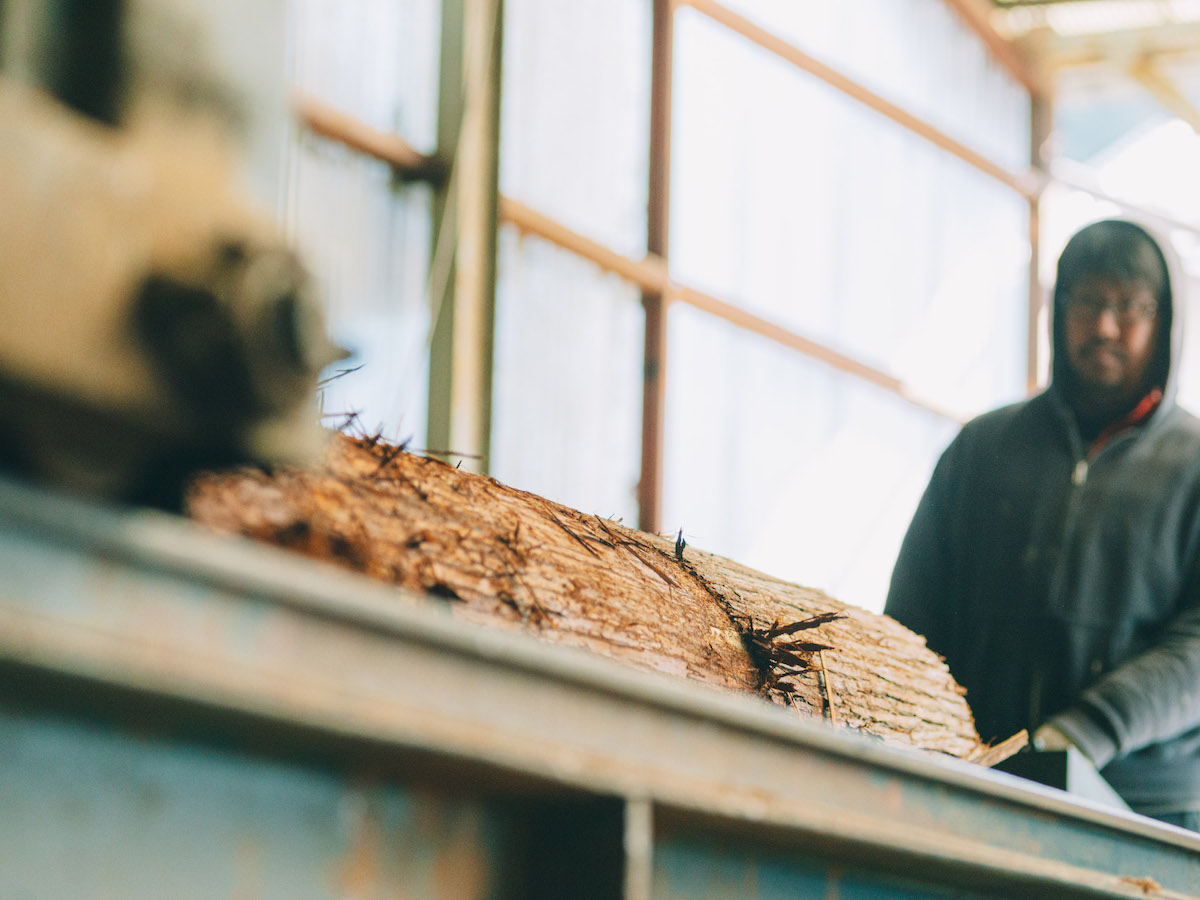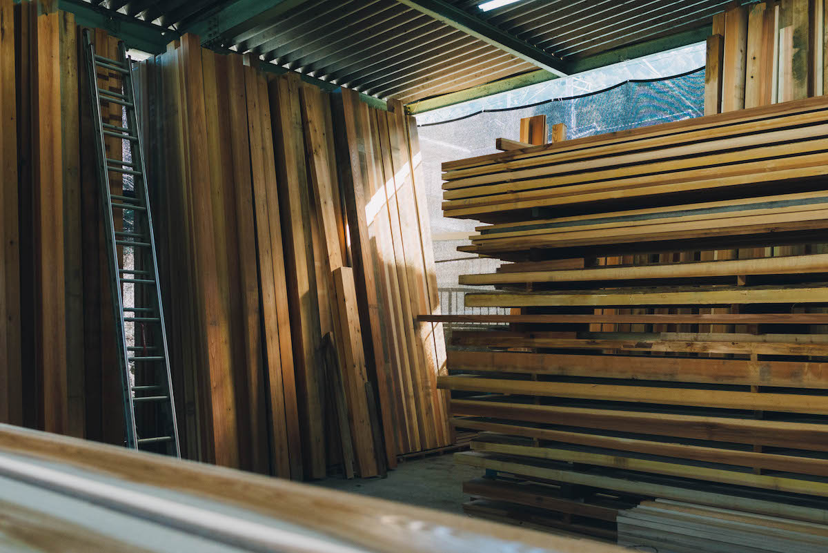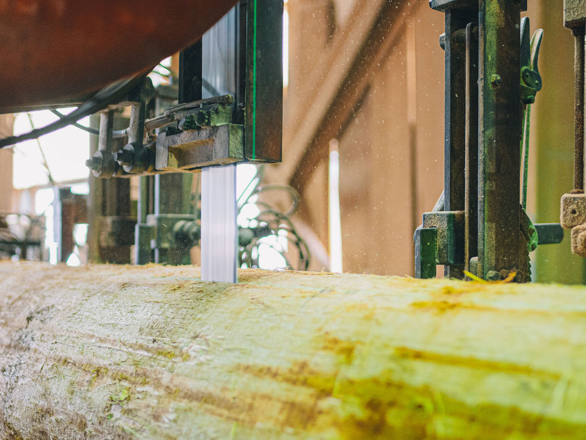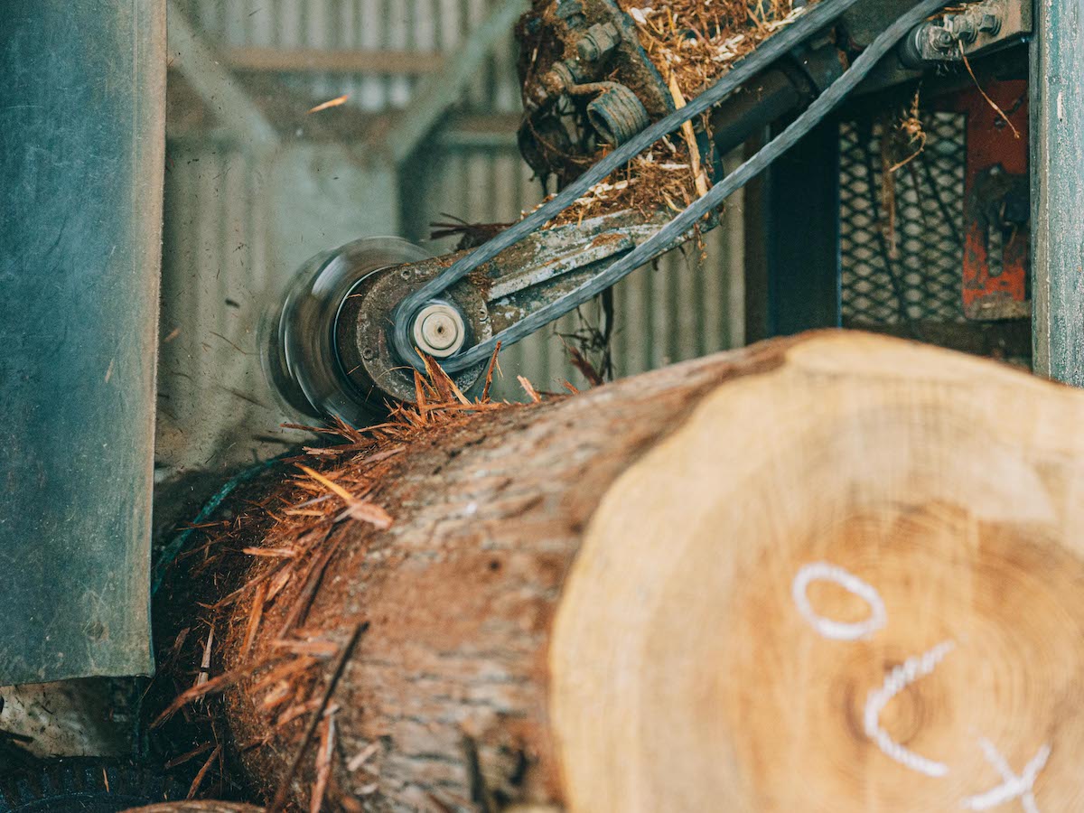 吉野スギを専門に取り扱う製材所『高橋商店』では、直径30〜60cmの丸太から、寺社仏閣や茶室、一般住宅から公共施設などで取り扱う建材を切り出しています。木目や大きさ、それぞれに個性のある原木を、用途にそって均一なものに揃えて切り出すその技術はまさに職人技。
