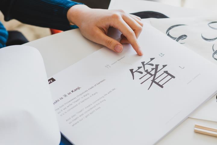 JanとJamesはイギリス人なので、箸の文化がどのような歴史を辿って日本に根付いてきたのか、あまり知りませんでした。まずはそういったルーツから共有する必要があると考えて、私自身、箸の歴史について入念に調べました。最古のお箸は竹で出来たもので、その後、木材を使ったお箸が中国で作られたそうです。日本では、聖徳太子によって送られた遣隋使が箸の文化を持ち帰ったことから広まり、割り箸は江戸時代から使われ始めたという歴史があることを知りました。他にも「箸」という漢字の「たけかんむり」は竹のルーツから来ているんじゃないか、「膳」という漢字の「にくづき」は人の体に使われる部首だから体と強く結びついていると考えられているんじゃないかなど漢字の成り立ち等も調べました。古来より箸は神事に使われてきたので、神道から来る日本人の“物を大事にする”精神とも結びつきが深いなど、いろいろな側面から「箸の文化」についてシェアしていきました。