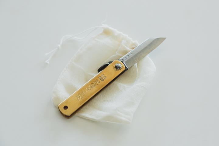 キットの中には、紙やすり10枚と肥後守(ひごのかみ)が入っています。肥後守は日本で古くから使われているナイフで、漢字が刻印されたデザインと優れた機能性から、海外でも人気があるんです。昔は鉛筆を削ったりするのに、日常的に使われていたようですね。