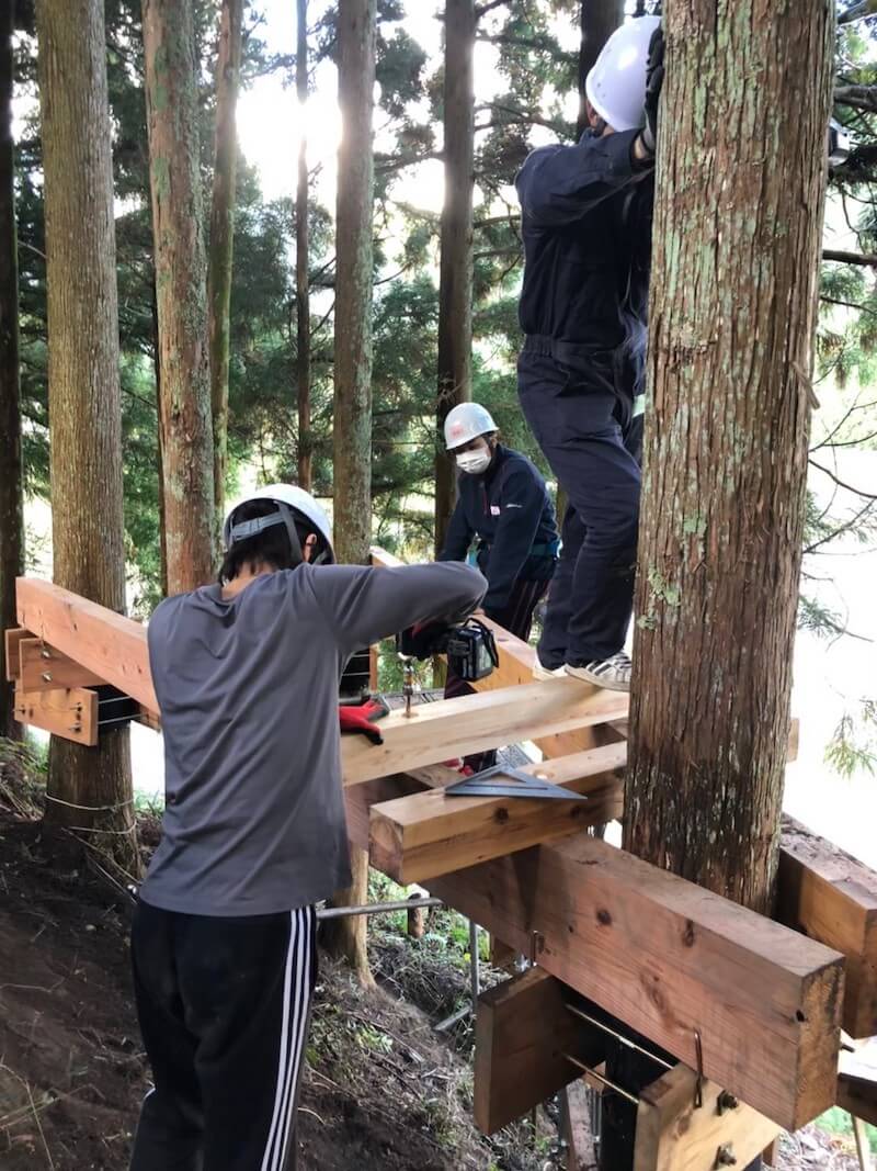 もともとTSURiHAは、初代メンバーが吉野の自然や町の魅力に惹かれて、大学で学んだ知識や技術を活かして吉野で何か活動ができないかと考えたところからスタートしました。「それならば吉野には木がたくさんあるからツリーハウスが良いのでは」と大学教授のアドバイスで吉野町役場を紹介していただき、そこから製材所、工務店、敷地の候補者の方などたくさんの方に協力していただき、これまで活動を続けてきています。