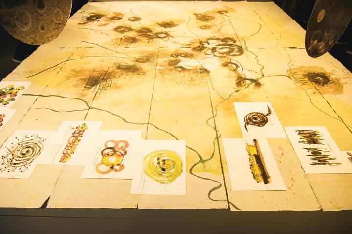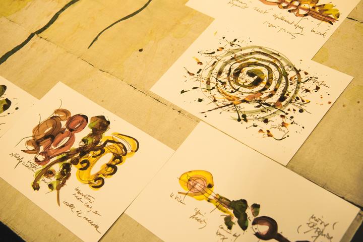 会場に入り、まず目をひいたのが、吉野で漉いた和紙に、水彩で描かれた「ラ・ヴィラ」の全体図でした。まるで抽象画のように詩情たっぷりに描かれた全体図の上には、いくつものスケッチが飾られています。