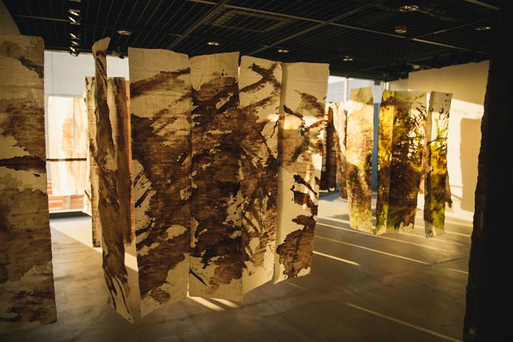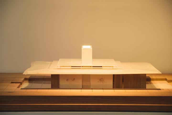 4階の展示スペースでは、RCRの自然観を表したインスタレーション「書かれた、そして描かれた風景」を展示しています。見る人によって印象は異なりますが、天井から吊るされた吉野の手漉き和紙はまるで森のようにも思えました。窓から差し込む光や風を受け、刻一刻と表情を変えます。和紙を通した光は暖かく柔らかく、まるで意思を持っているかのように雄弁です。実際の「紙のパビリオン」でも、ガラスの間に和紙を挟んで、屋根や壁に利用するのだそうです。