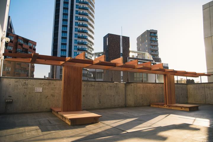 今回の展示のハイライトともいえるのが、「ラ・ヴィラ」で最初に建てられる建物であるという「紙のパビリオン」です。素材には、吉野スギのほか、吉野スギを使った和紙を使用。屋外には、吉野の大工・桝谷貴仁氏が加工を担った、パビリオンの構造体の一部を展示しています。屋外に展示された構造体からは、吉野スギの心地いい香りがほんのりと漂っていました。