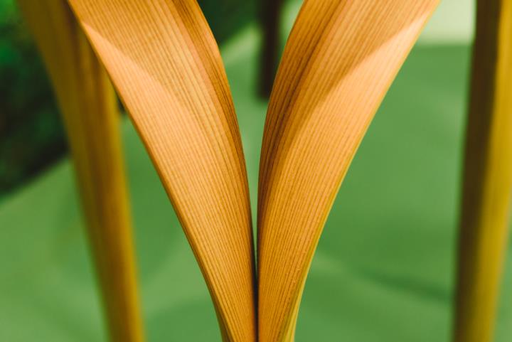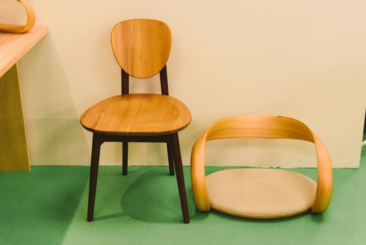 「僕の場合は曲げ木の技術を使うのですが、『CJ2 Legless Chair』では1.5mmの薄い板を何層にも重ねて、それを型を使わずに曲げることで成形していきます。これはアイルランドのジョセフ・ウォルシュが考え出した製法、造船などには古くから使われていた技法を応用したものですが、それを木に転用したのはジョセフが初めてでした。『CJ2 Legless Chair』はその技術を吉野スギでの家具製作に使用したものですね。今回の<rooms EXPERIENCE 36>は、他県や地域の特色が分かるのも面白いですね。また、今回の展示を通して、『あのときに見たあのイスを、このシチュエーションで使いたい』など、来てくれた方の生活の中に合うシチュエーションを見つけていただいて、それが吉野スギの魅力が伝わるきっかけにも繋がれば嬉しいです。その結果、針葉樹で家具を作ることがより一般的になっていけば、僕らとしてはとても嬉しいことだと思っています。」