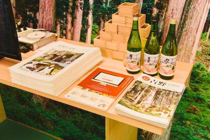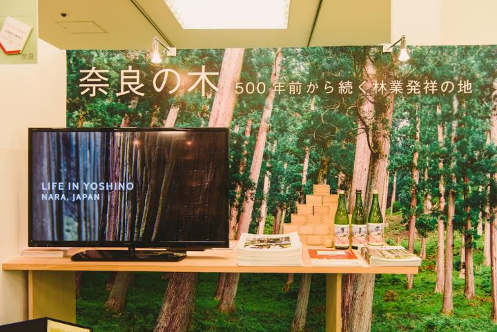 奈良の木ブースでは、吉野スギの魅力を伝えるDVDの放映や、「やたがらす」、「花巴(はなともえ)」、「猩々(しょうじょう)」といった奈良県吉野の地酒3銘柄の試飲、酒樽や枡なども展示。奈良の木ブランド課による「奈良の木のこと」リーフレットの配布なども行なわれ、来場者が様々な角度から奈良の魅力に触れている様子が印象的でした。