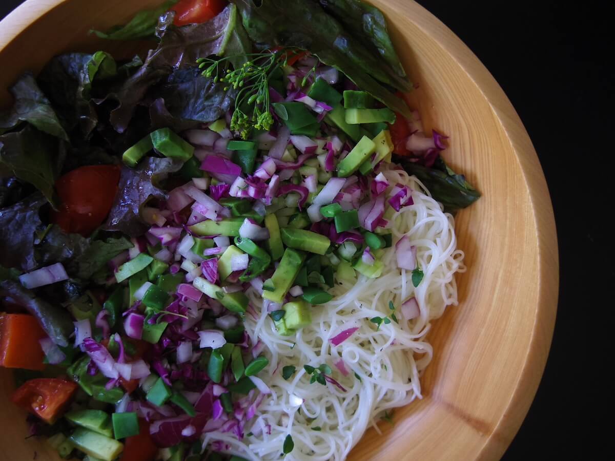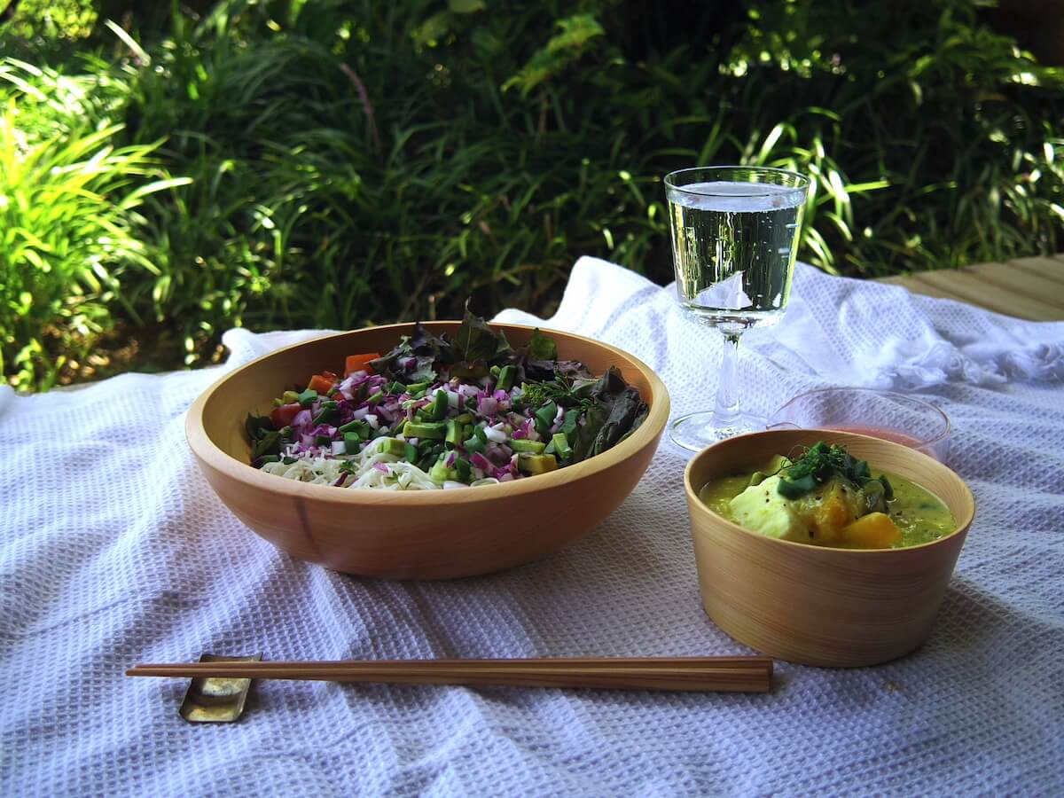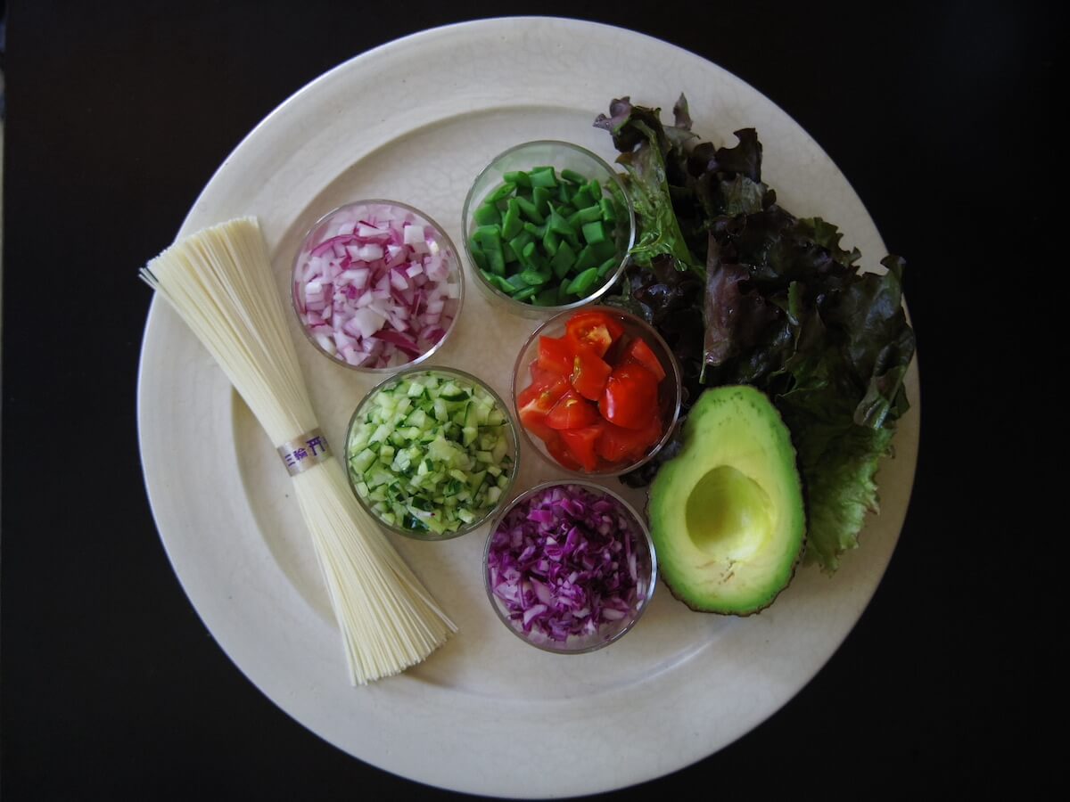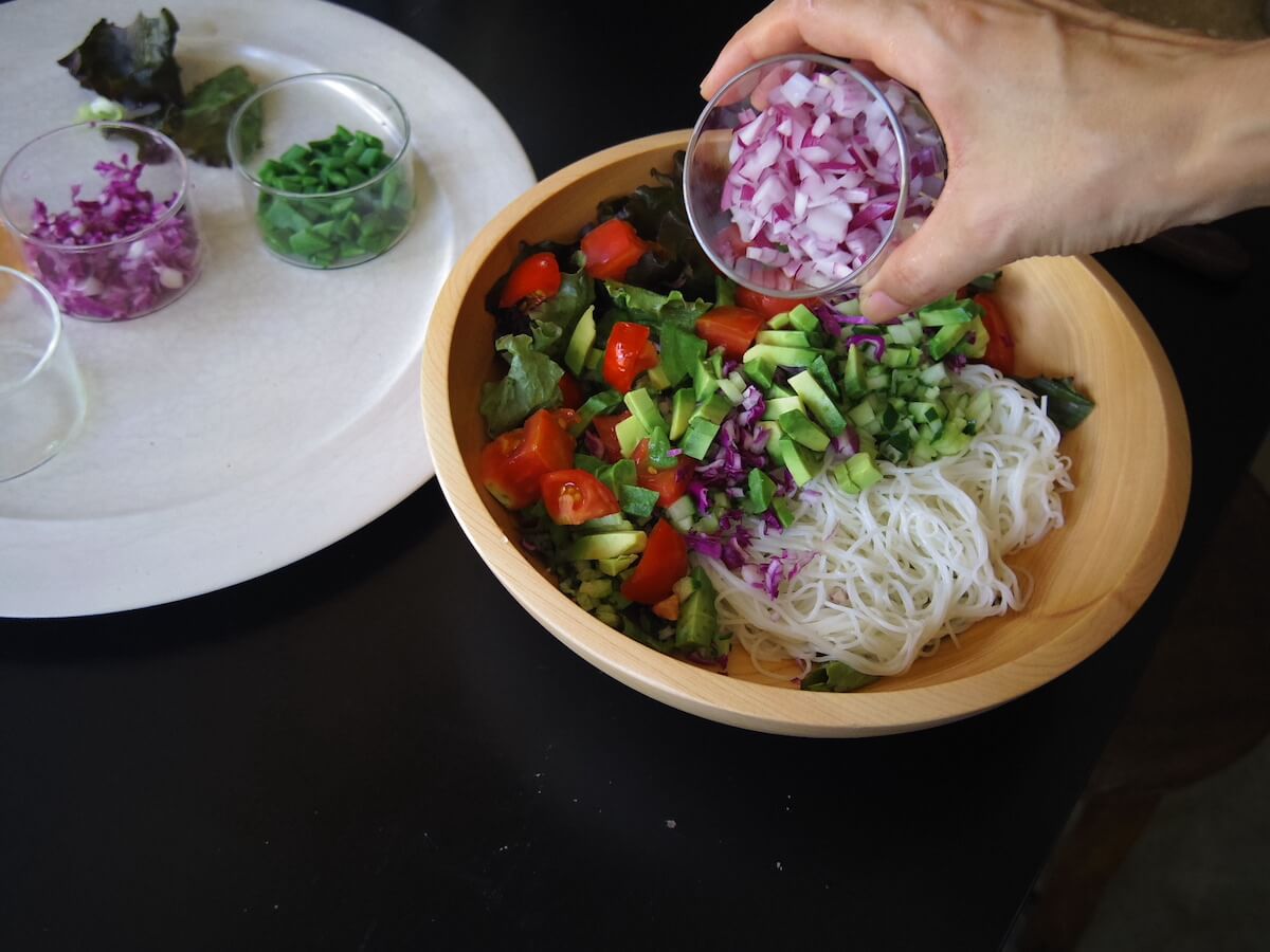 生で野菜を食べたい季節でしたので、たっぷりめのサラダ、そして体を冷やしすぎないように温かいスープもあると嬉しいなと。そして、少し太めで麺類も食べやすそうなお箸なので、サラダと麺を組み合わせた少し和の要素があるレシピが良いなと思いました。季節と道具から生まれたレシピです。