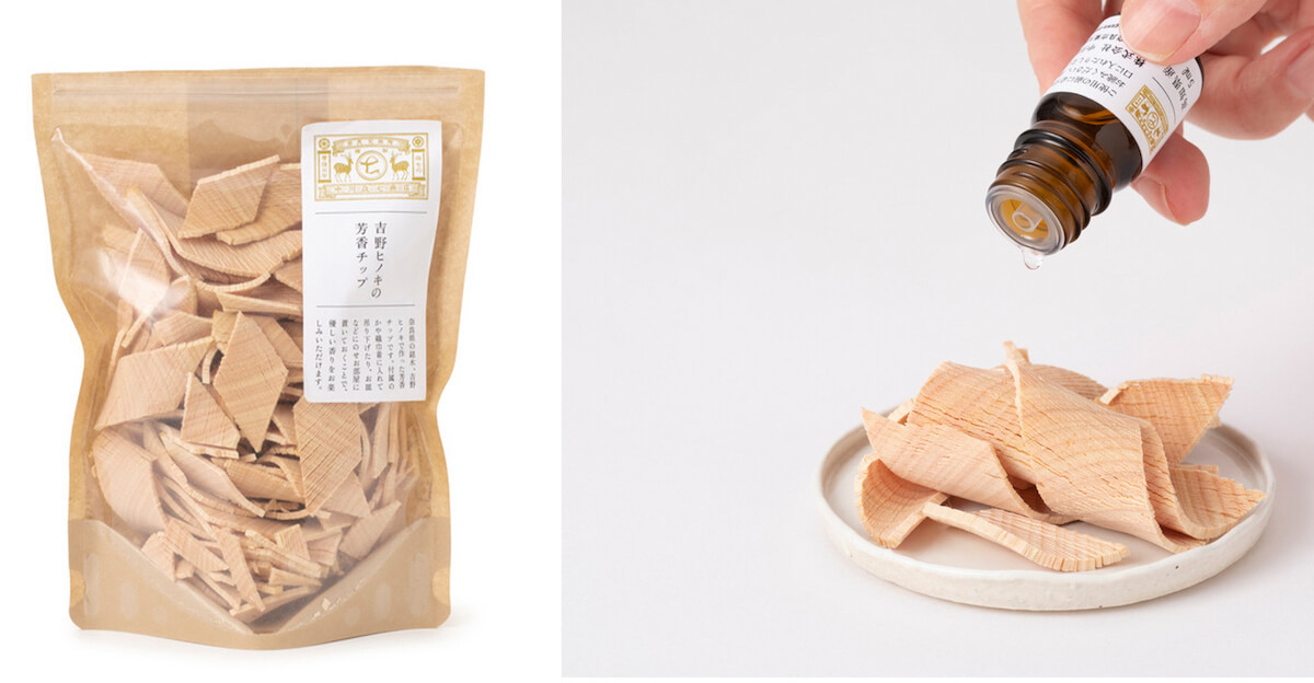 そこで、より木の香りが活きる素材として出会ったのがウッドチップです。削りたてのウッドチップは香りが強いことを知り「吉野ヒノキの芳香チップ」が生まれました。生の木をスライスして時間を置かずにパッケージしているので、開封すると少し湿っていて生々しい木の香りがふわっと広がります。職人さんが作っていらっしゃるものや工房を見せていただきながら、素材を活かせそうなアイデアを見つけていくというのは、吉野が近いからこそ出来ることだなと思います。
