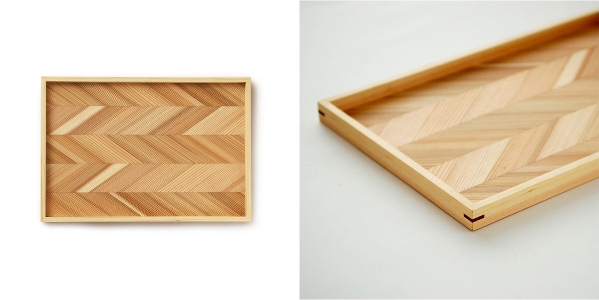岩井 私が何よりも惹かれたのが、吉野スギの木目の美しさでした。「こんなに均一な木目があるんだ」というのが最初の印象で。そういった素材の良さと美しさが活かされたものを目指して企画したのが「吉野杉のトレイ」です。素材をヘリンボーン状に組むことで美しさの中に強度を共存させることができました。