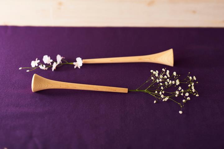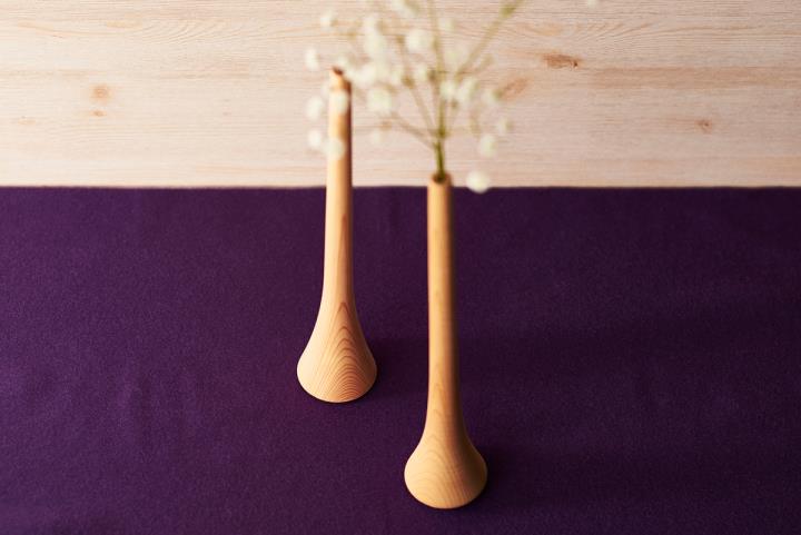 凛とした姿が印象的な一輪挿し『そよそよと』。淡い木の色合いや細長くスッキリとしたデザインの美しさは言わずもがな、そのネーミングの由来となる形状が素晴らしい一品。丸みを帯びている底の部分に適度な重さを加えて作られているため、風に吹かれても倒れず絶妙なバランス感でゆらゆら揺れるのです。風鈴のように、風情を感じられるお気に入りのプロダクトになるかもしれません。