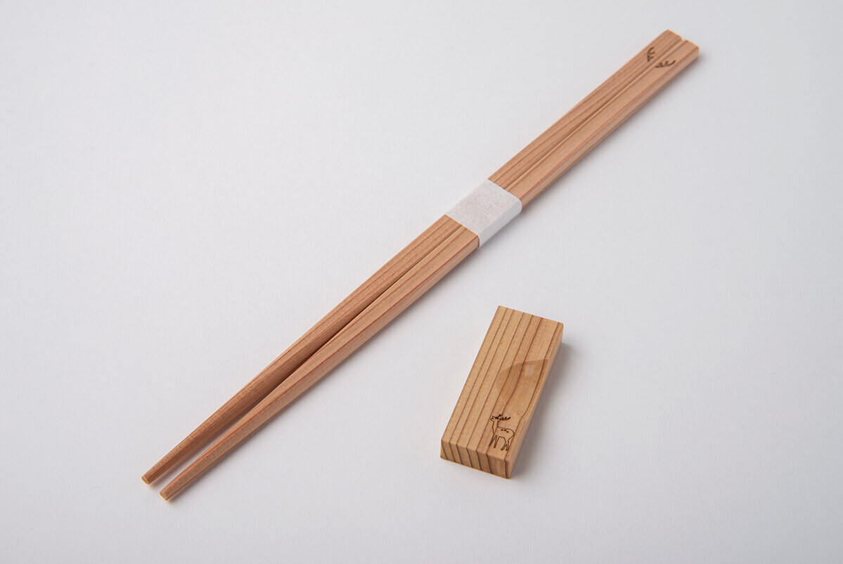お箸の端に鹿のツノが描かれたとってもキュートな『箸・箸置きセット』。まっすぐ伸びる吉野杉の美しい木目と繊細な焼き加工の絵柄は、女性らしく柔らかなデザインのお箸です。箸置きには凛と佇む鹿が描かれ、セットで使うとより一層可愛らしい印象に。奈良県の代表的な優良材である吉野杉を使用したお箸に奈良を象徴する鹿が焼印された箸置きセットという、まさに奈良の魅力が詰まった逸品。また、洗って繰り返し使えるので、お土産にも喜ばれること間違いなしです。