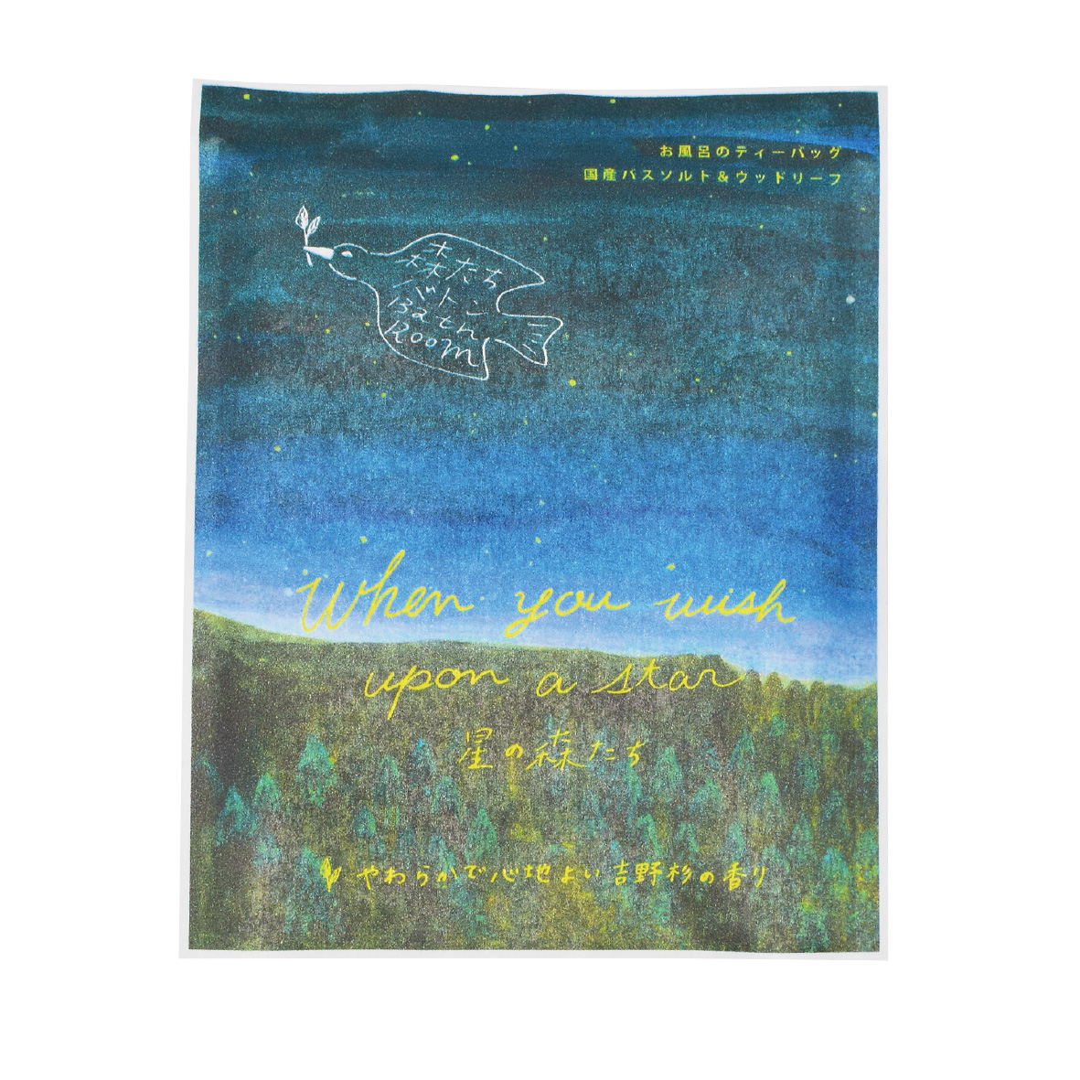 『森たちバトン バスバッグ 星の森たち』は、柔らかで心地よい吉野杉の香りと星空を想わせるリラックスブルーの湯色が楽しめるバスバッグです。国産バスソルトに素肌のトリートメント成分として吉野杉の木材チップや森の天然精油・エキス等を配合しています。やわらかな甘みのある香りが特徴的で森の中にいるような自然を感じるバスタイムが過ごせそうですね。日々の疲れが癒されること間違いなしのアイテムです。