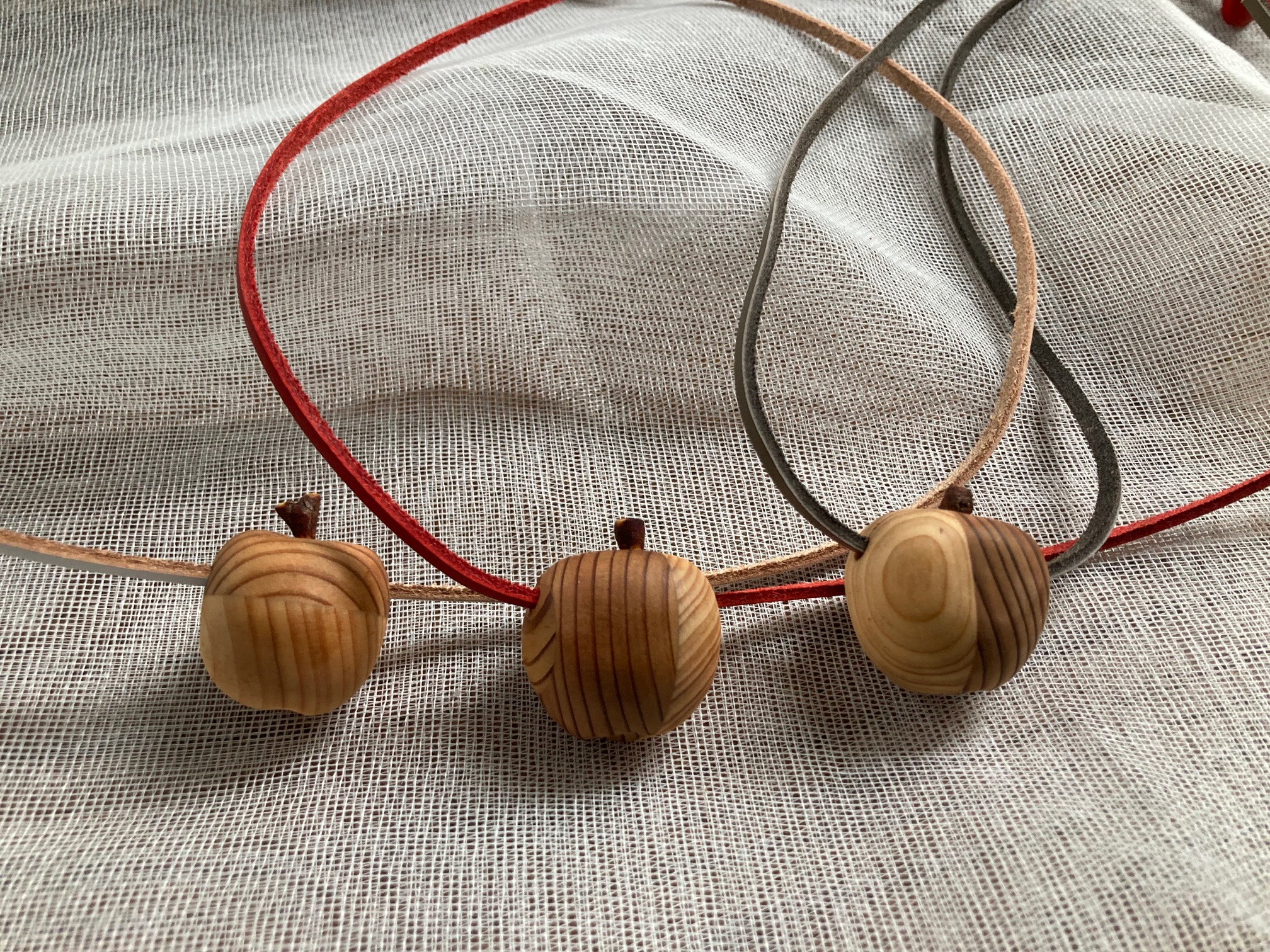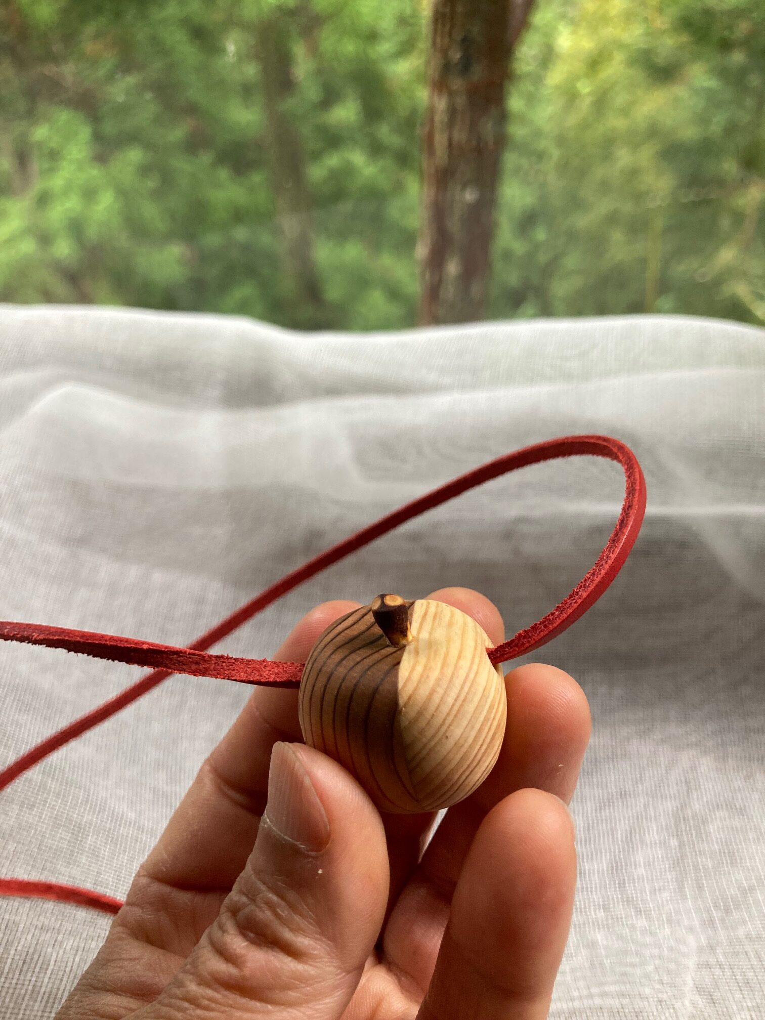 見た目が愛らしい吉野杉と吉野桧でつくられた『りんごのペンダント』は、吉野杉・吉野桧が育まれる地で生まれ育った作家の「“触れて感じる”をテーマに、暮らしにさりげなく長く寄り添えるモノづくりを」との想いが込められたアイテムです。りんご型のペンダントは、吉野杉と吉野桧ならではの繊細な木目が際立ち、ずっと眺めていたくなるような美しさを持っています。また、触れることでどんどん艶が出てくるので、経年変化も楽しめますし、愛着も湧いてきそうですね。おしゃれとして楽しめるのはもちろんのこと、杉と桧のやさしさ・温もりを感じることができるペンダントは、長く大切に身につけたいアイテムです。