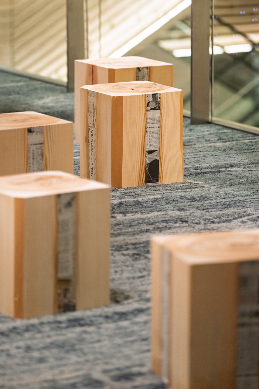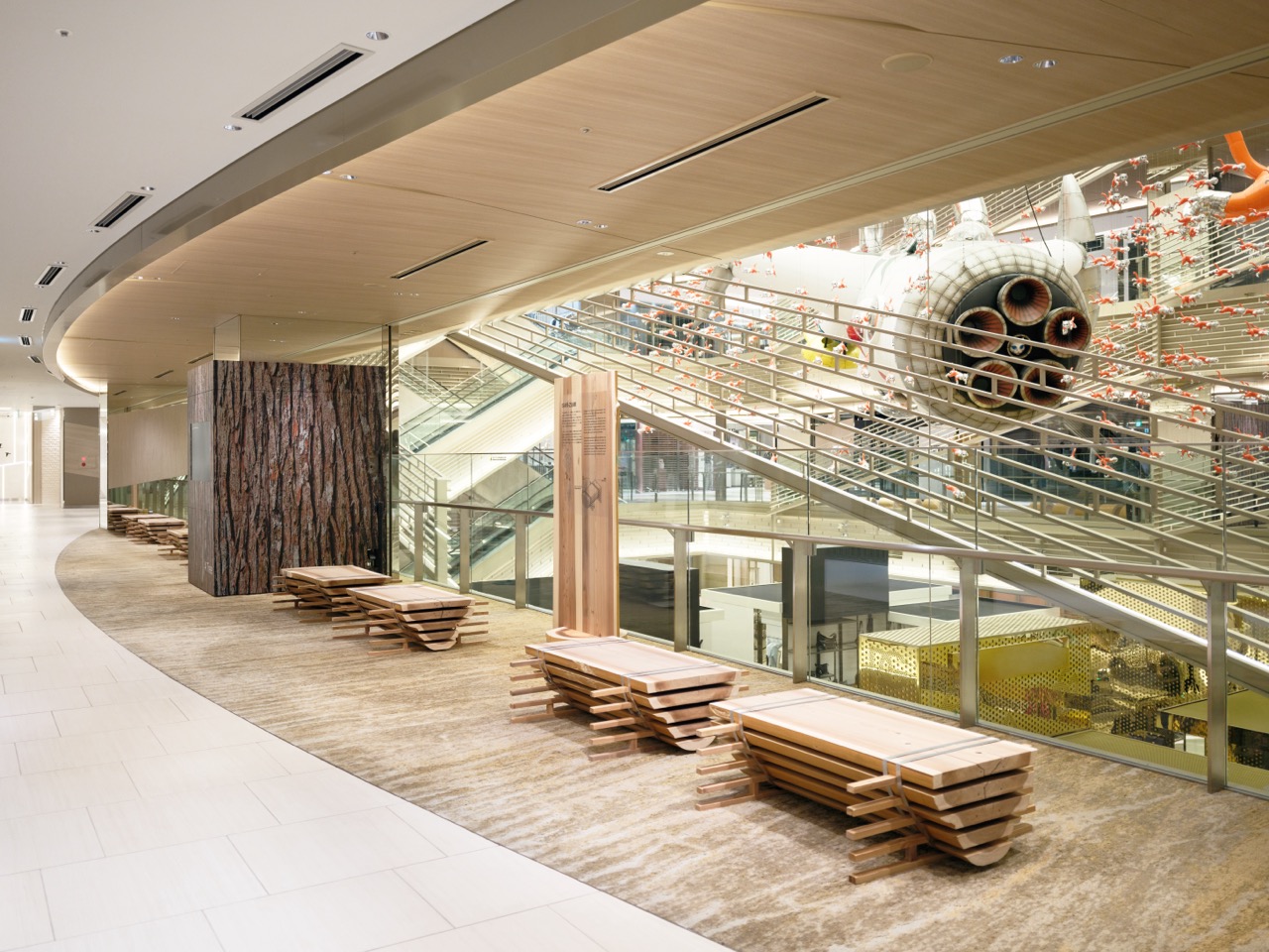 まず、ご紹介するのは、『GINZA SIX』館内の3F~5Fの中央吹き抜け空間に隣接するレストスペースにあるファニチャー。この作品を手がけたのは、吉野林業地域で1500ヘクタールもの山林を管理している『豊永林業株式会社』と、県産材を中心に素材の魅力を活かした品質の良い木材を生産している『株式会社大谷木材』。両者の専門的な知見と技術により、吉野杉の美しい木目や強度といった特徴が最大限に活かされ、空間に温かみと品格をもたらす作品となっています。