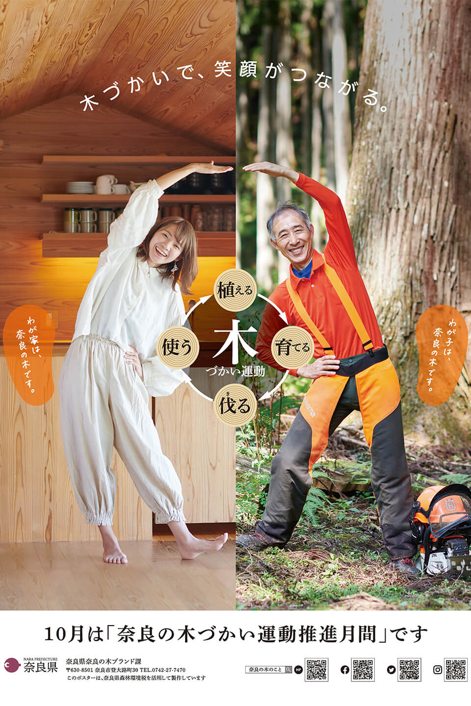 奈良県でも、毎年10月を「奈良の木づかい運動推進月間」と定めており、木を使うこと(=木づかい)により、木を売ったお金が枝打ちや間伐など森林を育てることに使われ、「植える、育てる、収穫する、使う」という、森林環境の維持向上につながる(=木づかいサイクル)を伝える活動をしています。