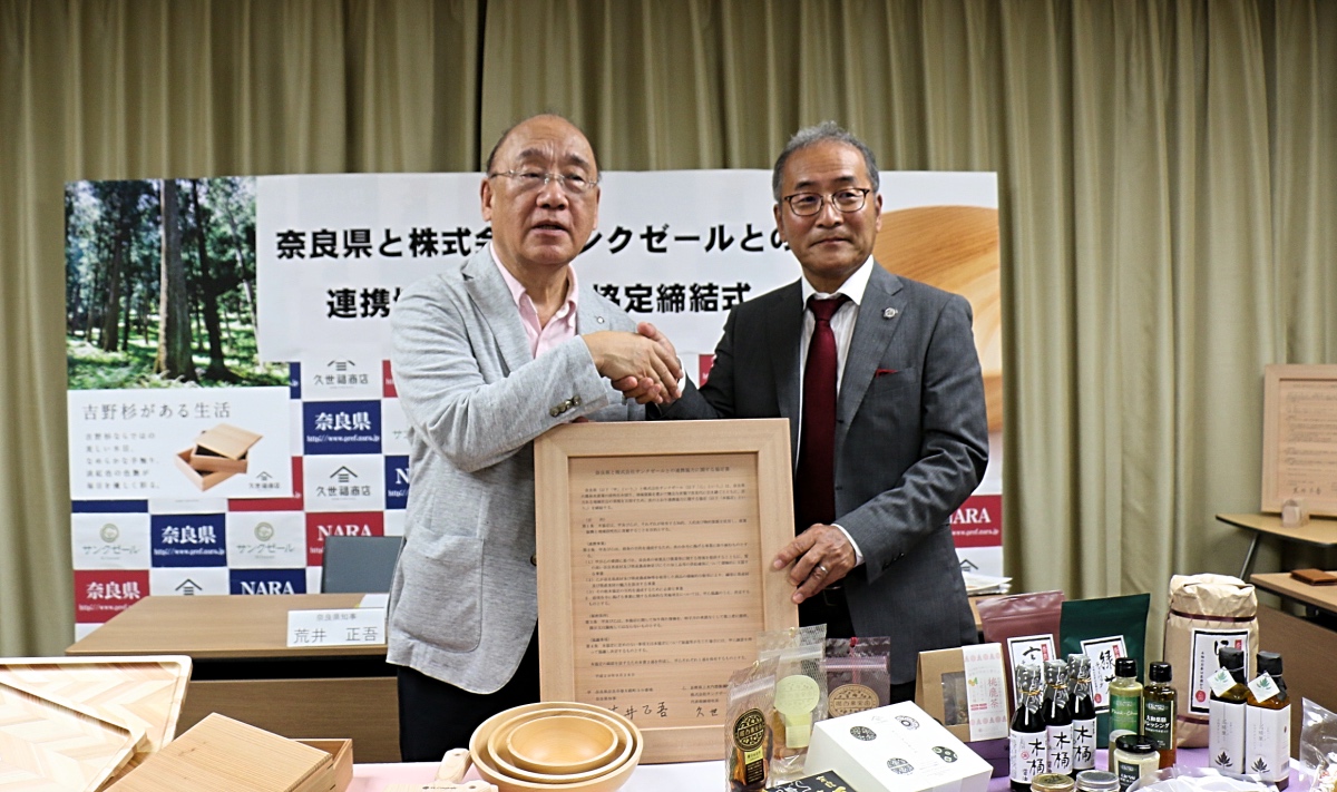 このパートナーシップ協定の目的は奈良県の産業振興と地域活性化をすすめること。荒井知事、久世社長はそれぞれ下記のコメントを発表しています。