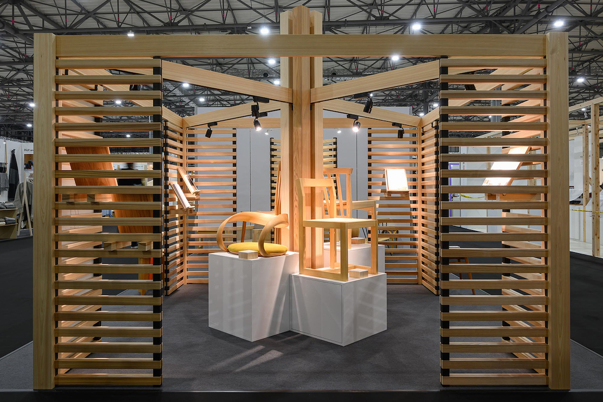 展示ブースは、木目が細かく真っ直ぐな美しい奈良の木(吉野材)を使った椅子の魅力を際立たせるアートギャラリーをイメージしたデザイン。こちらは組み立て式で、持ち運べる仕様になっているため、今後のイベントでも再利用することができるなど、木のサスティナブルな魅力も組み込まれた展示ブースとなっていました。