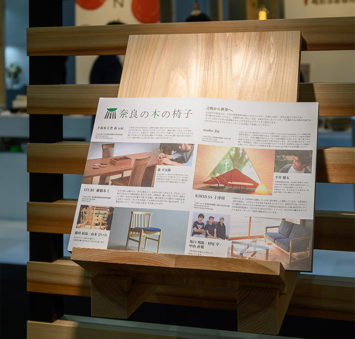 今回出展したのは、奈良県吉野郡を代表する4つの工房。展示ではつくり手のこだわりと、奈良の木の美しい木目、そして木肌を生かした椅子がずらりと並びました。今回は、作品のつくり手、4つの工房の作品について、展示の様子とともにご紹介していきます。