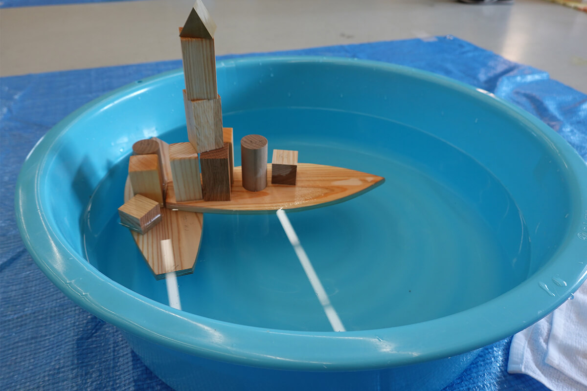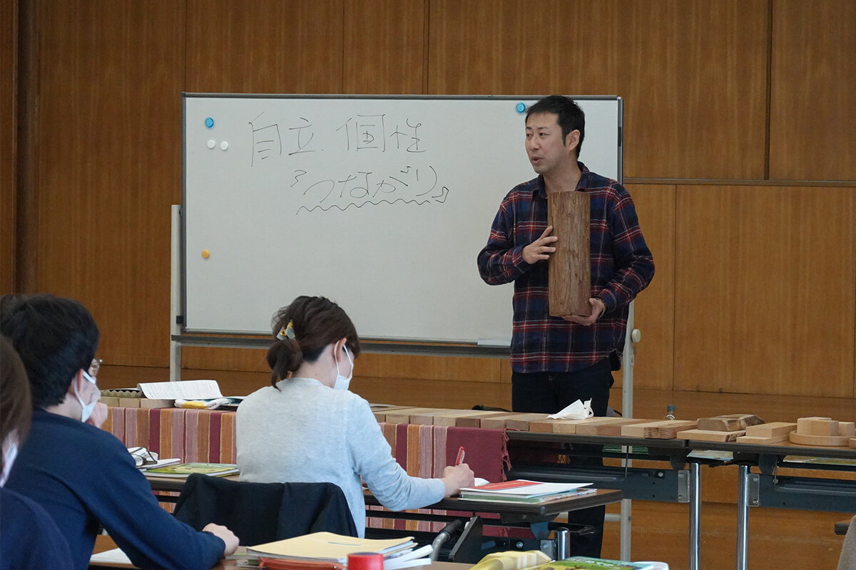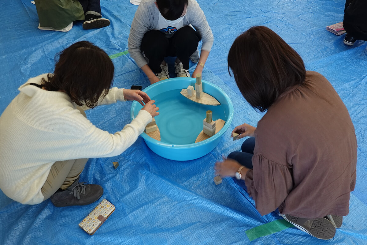 午後の第2部では、木育プログラムを体験する2つの実習が行われました。1つ目は、木を五感でじっくり感じるために、目を閉じて触る、匂う、耳元でカチカチ音を鳴らすことなどを取り入れた「水の積み木づくり」。積み木はすべて水に強い木(スギ、ヒノキ、ホオノキ、クリ、ミズナラ、イチョウ)を使用。木を紙やすりで削るための道具の使い方の説明や、水遊びの前に絵本の読み聞かせで関心を引くなど、福島さんの日々の活動における工夫やアドバイスが伝授されました。