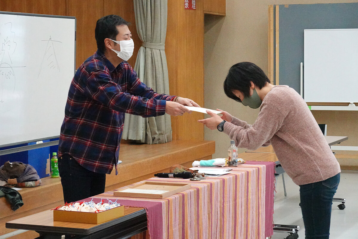 そして最後は、「木育インストラクター資格認定証」の授与式です。福島さんの手からみなさん一人一人に認定証が授与されました。
