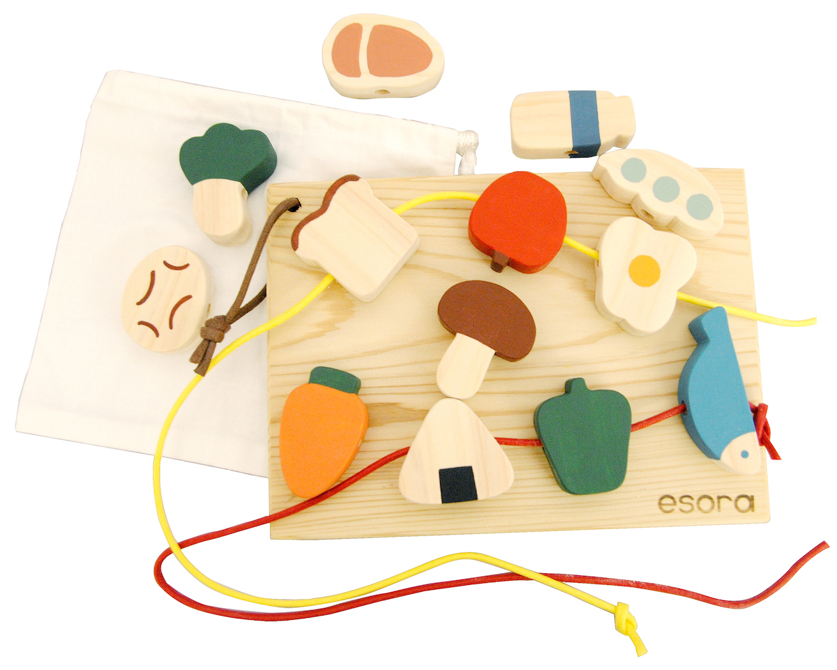 コロコロと可愛い食べものに紐を通して遊ぶ『たべものひもとおし』は、1日に必要な栄養素を考慮して選定された13種類の食べものとまな板、紐2本に収納巾着がセットになっていて、お片づけも簡単。紐を通して遊べるだけでなく、おままごととしても大活躍です!