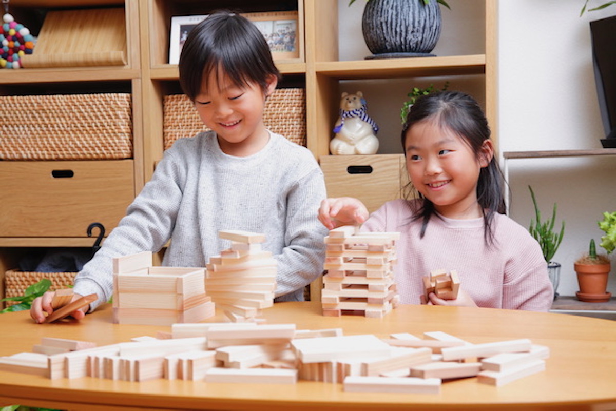 木の柔らかさが感じられる仕上がりと、ほっこりと可愛らしいデザインが特徴的なおもちゃブランド「esora」。「日本の木で、日本のこどもにあそびと学びを」をコンセプトに、吉野杉や吉野桧といった地域材を使った子どものためのプロダクトを提案しているブランドです。ブロックの塗装には、赤ちゃんが舐めても安全なように、ミルク原料の天然由来の塗料が使われています。