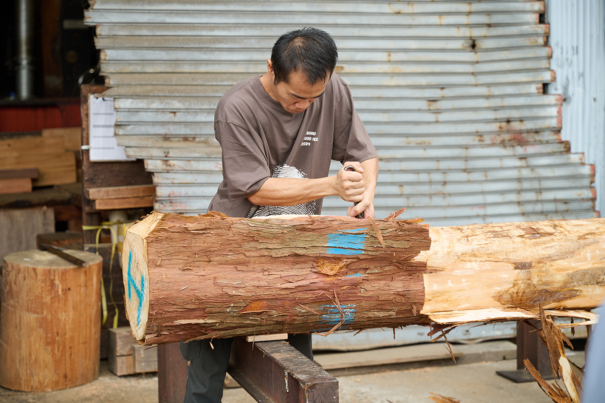 製材に入る前には、まず皮むきの工程があります。皮むきには手作業と機械による方法があり、この日は手作業の様子が紹介されました。現在ではほとんどが機械化されていますが、桧の樹皮を重ねていく日本の伝統的な屋根工法「檜皮葺(ひわだぶき)」の材料となる檜皮をとるために手作業が必要とされる場面もあります。ヘラを皮の隙間に差し込み、一定のリズムで剥がしていく様子は、熟練の技ならではの工程です。