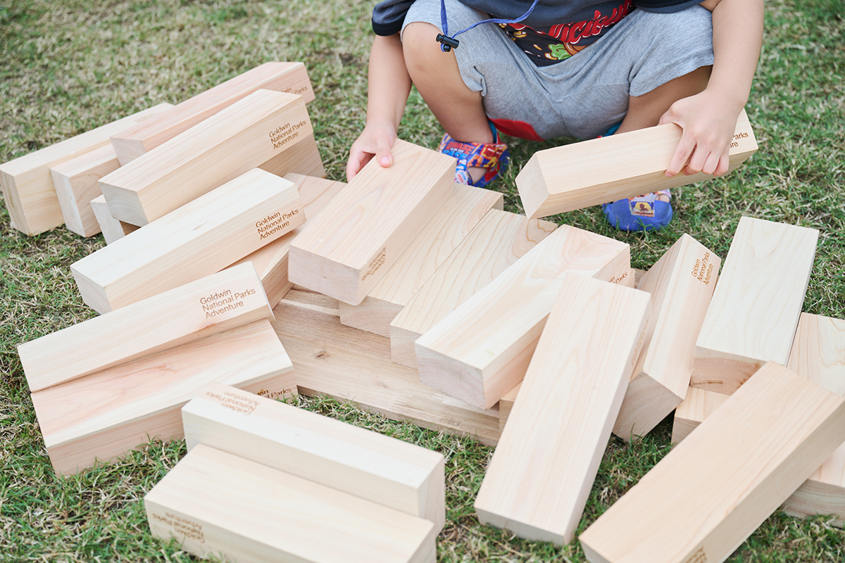 メイン会場に戻り、三戸さんは芝生のある広場を散策されました。各ブースで木にふれる体験ができますが、その中でも端材を使った木のバランスブロックに注目。これは、「THE NORTH FACE」などを展開するスポーツメーカー・株式会社ゴールド・ウィンが手掛けるプロジェクト「PLAY EARTH ADVENTURE」のコンテンツです。