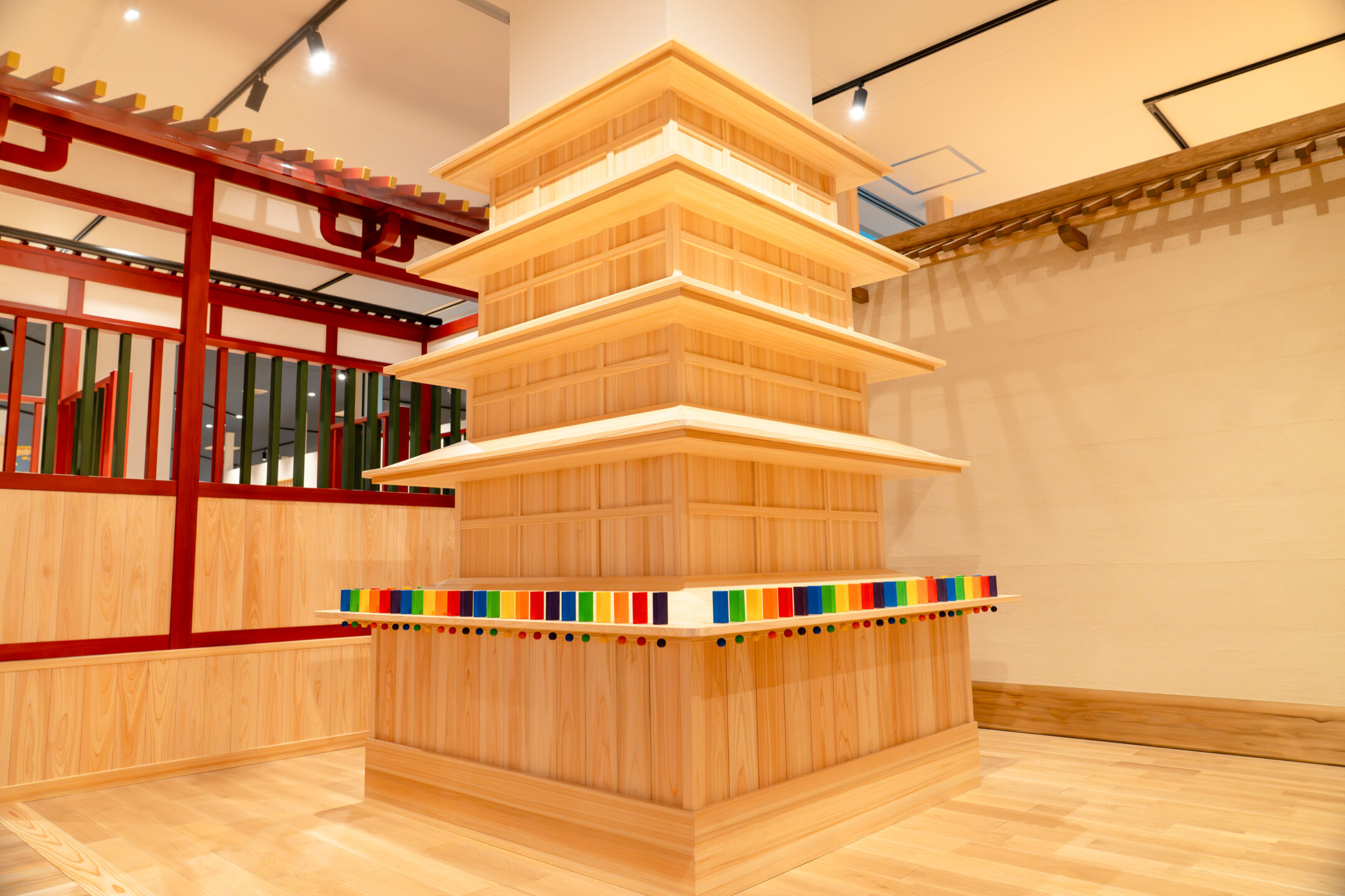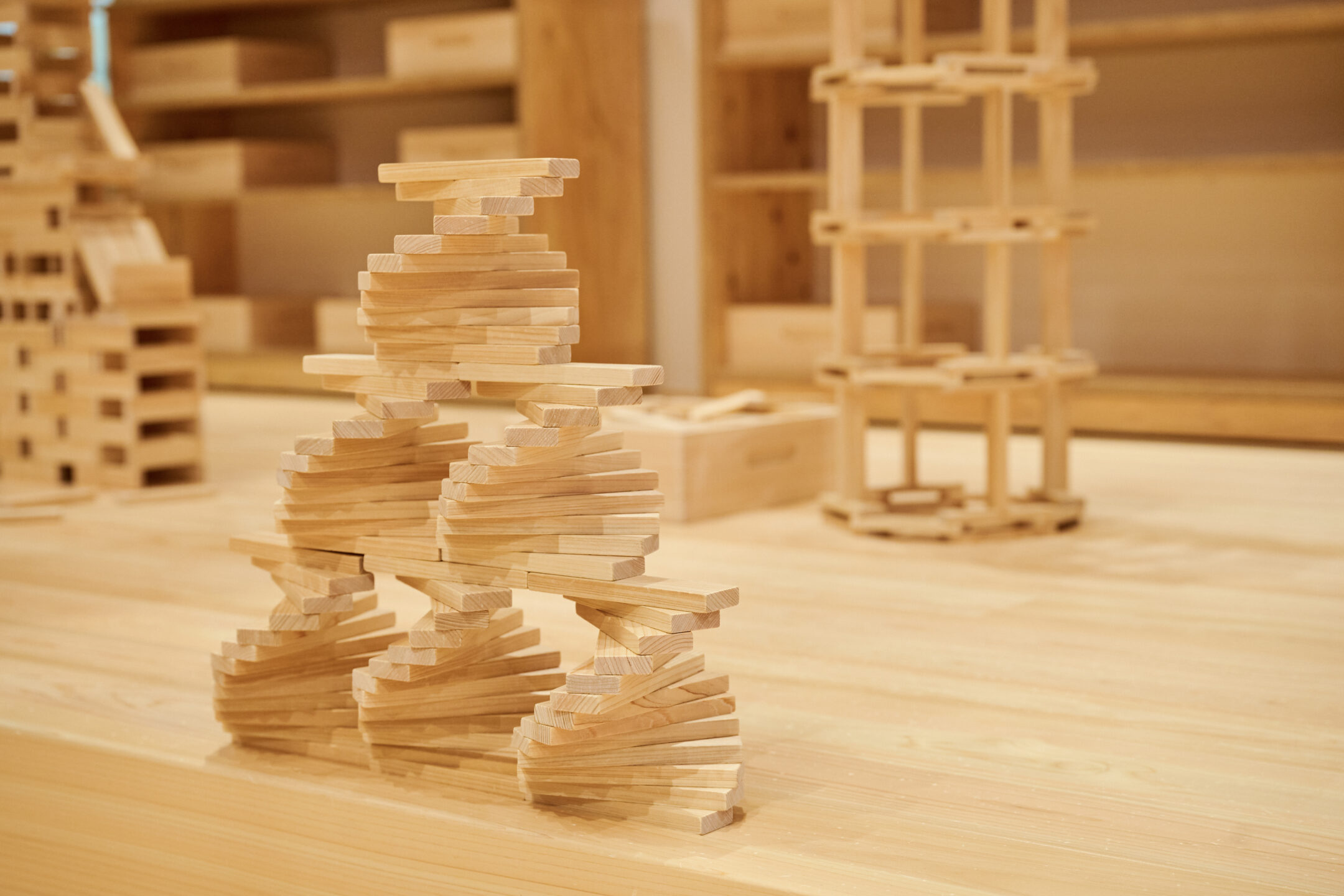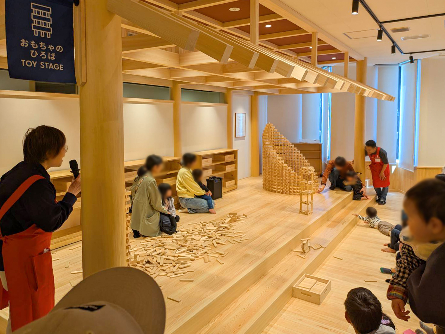 さらに吉野桧で作った2000ピースの積み木で遊べる「おもちゃのひろば」のステージでは、建物のように高く組み上げた積み木を一瞬で崩す「積み木倒し」が1日2回開催されており、館内の見どころのイベントのひとつとなっています。