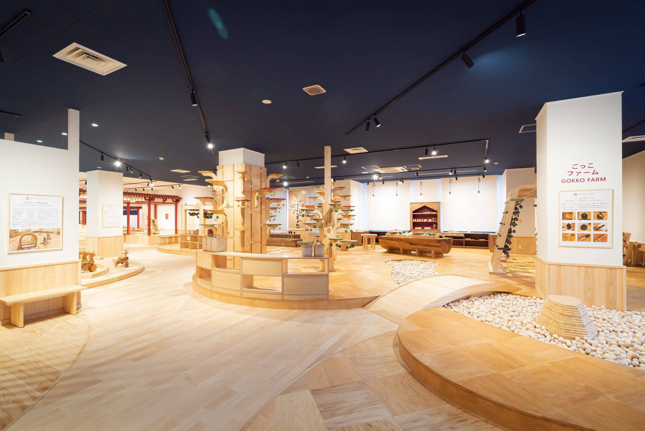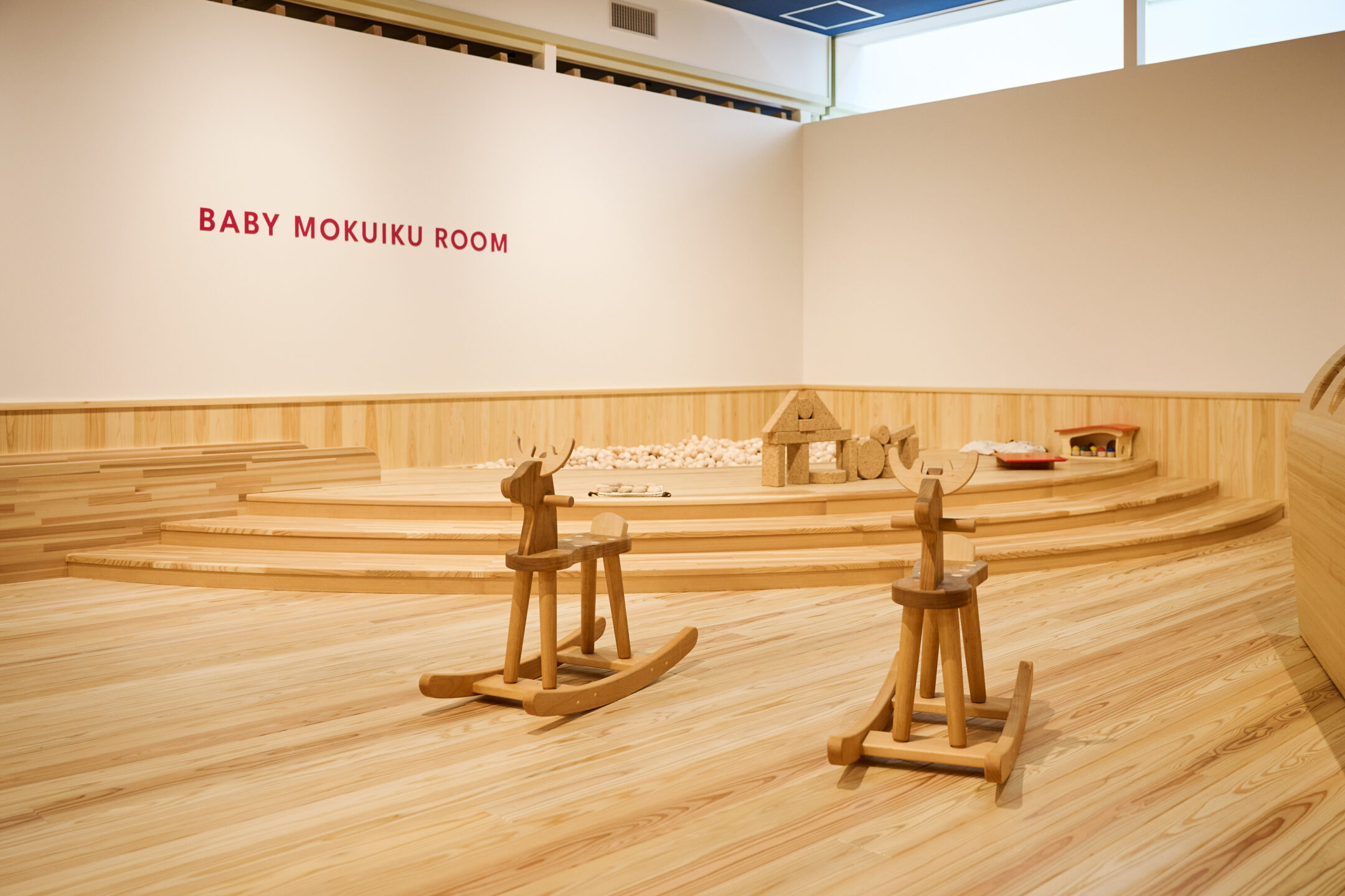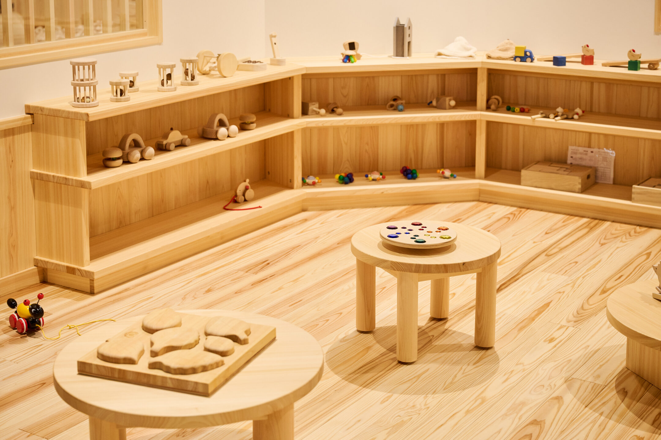 奈良県といえば、吉野杉、吉野桧が全国的に有名ですから、おもちゃ美術館を構想したときから館内には必ずそれらの木材を使うべきと考えていました。床や天井、柱には吉野杉・吉野桧を使用し、とくに「赤ちゃん木育ひろば」はすべて吉野杉で出来ています。吉野杉の温かみがあってやわらかい質感が、赤ちゃんにとっても心地がいいんですね。また、「おもちゃのひろば」の積み木も吉野桧で作られています。