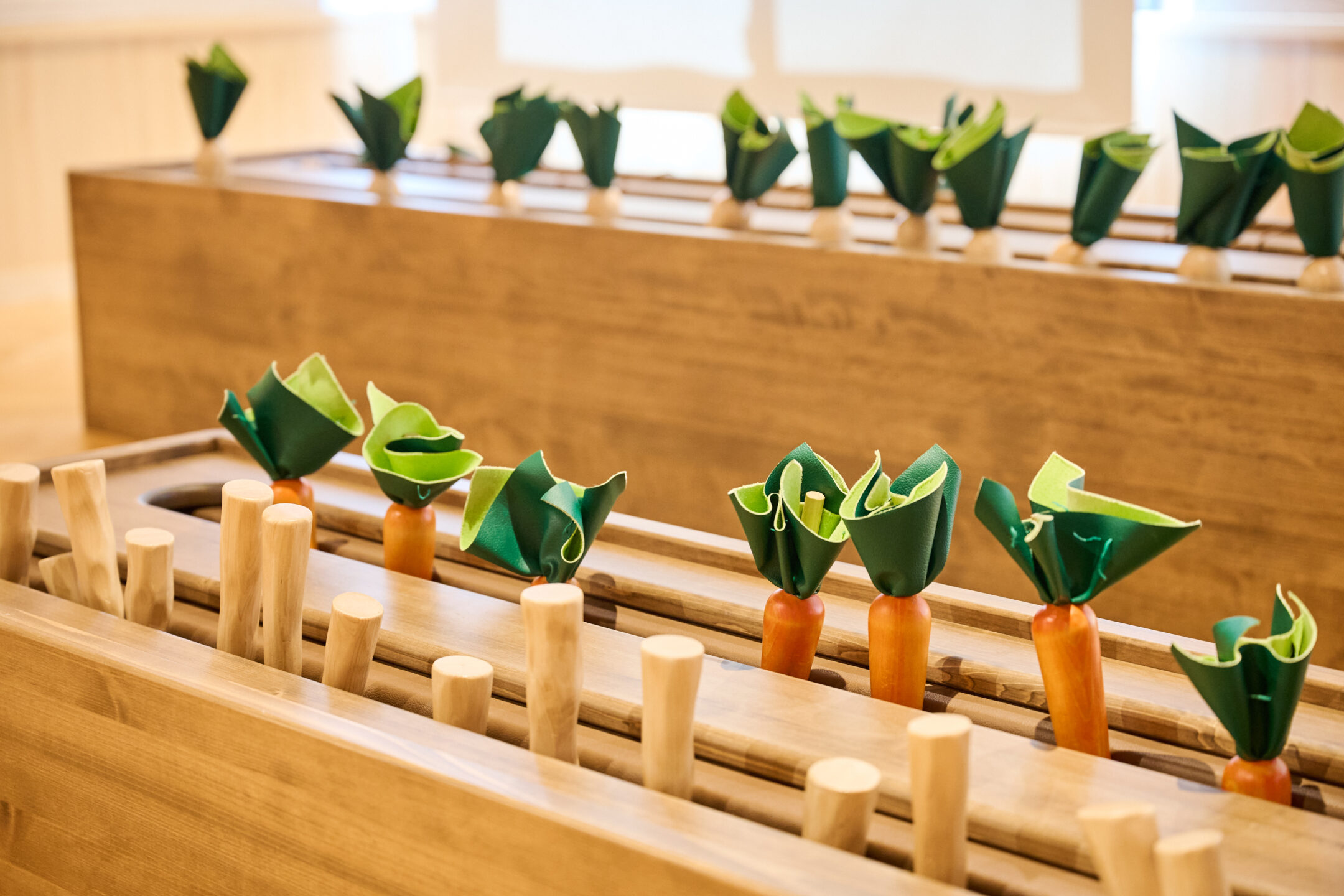 全国にあるおもちゃ美術館ではその地域の特徴を生かし、地元の自然や特産物を館内の空間に取り入れるなど、それぞれに特色が異なります。『奈良おもちゃ美術館』の場合は地域の独自性を感じることができる二つの空間があります。一つは奈良の特産物や風景を表現した空間です。「ごっこファーム」では、奈良特産の野菜や果物をテーマにしています。また、「おもちゃのもり」には、奈良県産のさまざまな形をした木が立っていますが、それは県内の森林面積が約8割である奈良県の豊かな森林をイメージすると同時に私たちの法人が目指す多種多様な人々との共生も表現しています。このコーナーを訪れた方からは「色々な木の種類があって奈良県産材にもいろいろな木があることがわかった」という声も届いています。