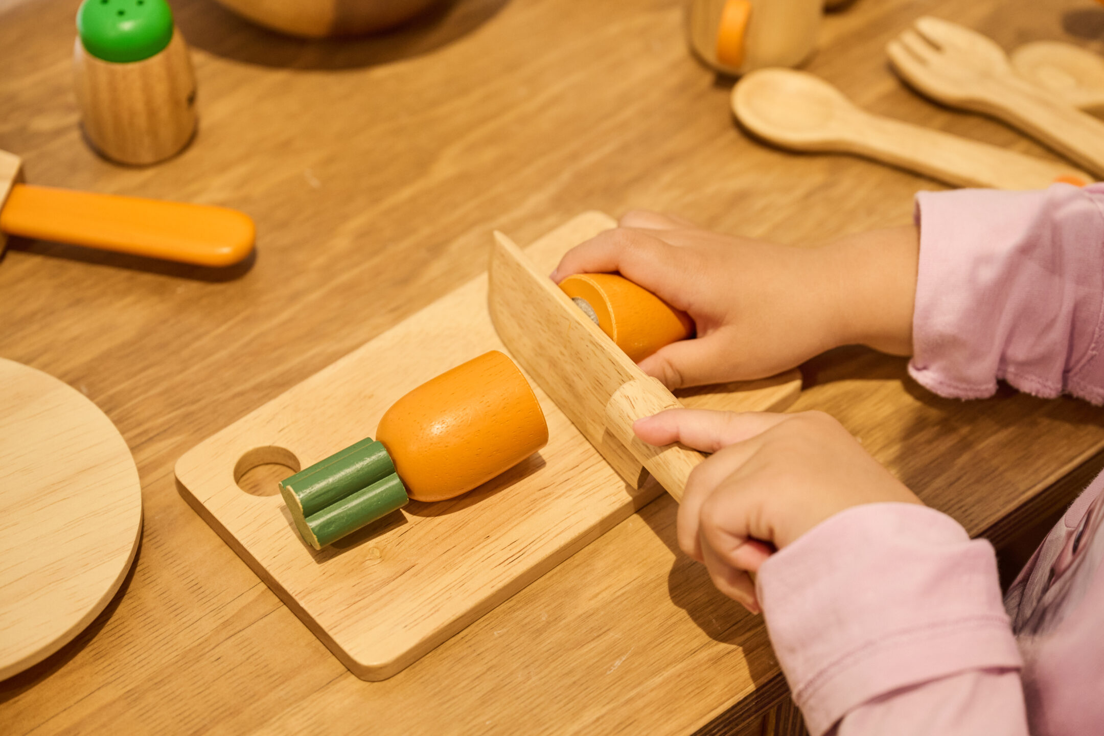 また、「ごっこファーム」では、大和丸なす・大和いもなどの大和野菜をはじめとする百点以上の地元農産物を収穫して木製キッチンでお料理ごっこができます。もちろん野菜も果物もすべて木でできています。