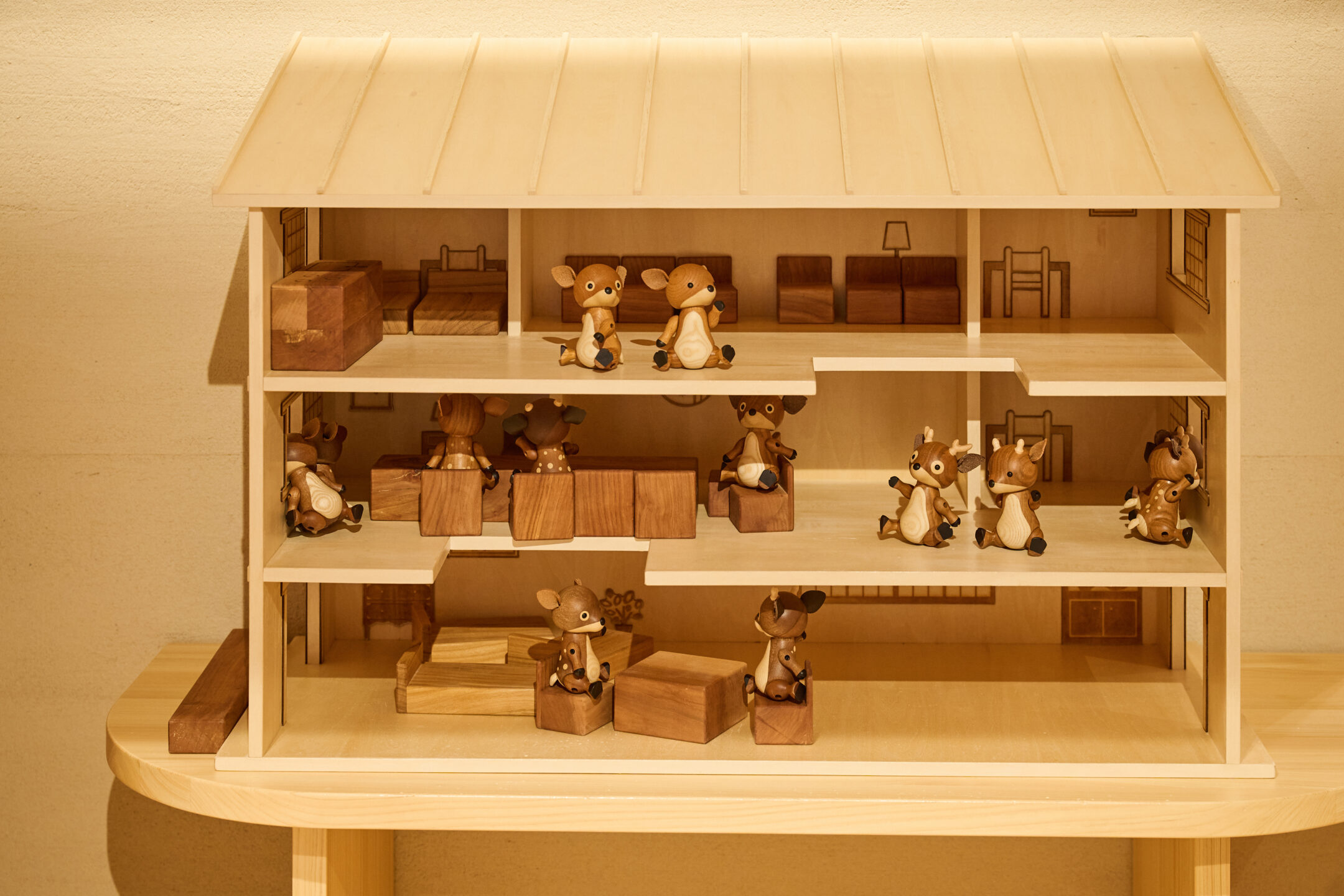 2階のおもちゃ美術館エリアでは、床や天井などの内装に奈良県産材が使用され、館内は爽やかな木の香りに包まれています。靴を脱いで館内に入場すると、足の裏に木のやわらかな感触が伝わってきます。