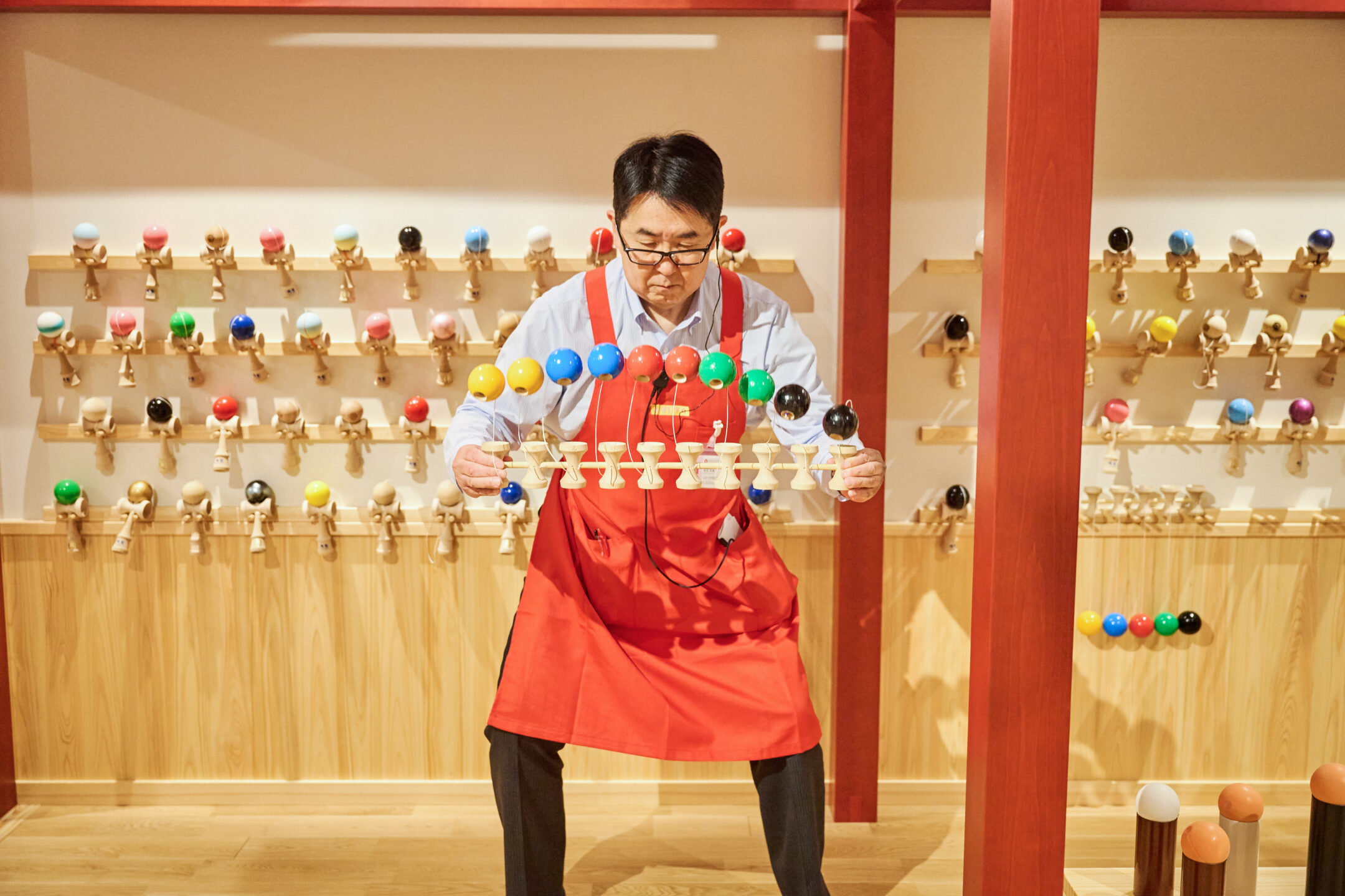 木という素材の温かみ、手ざわりに癒される感じですね。それに実際、木のおもちゃを手に取って遊んでみると、なかなか奥が深いんです。おもちゃひとつにしても、いろいろな遊び方があって、例えば、けん玉でも玉をのせるだけじゃなく、複数のけん玉で玉の部分だけを積み重ねていくのも面白い。遊びを通じて自分なりに工夫することで子どもたちの創造性を育むことができます。とくに積み木遊びは、いかにバランスよく高く積み上げられるか頭を使うので、子どもだけじゃなく大人もハマります。親子で競争しあって楽しめますよ。