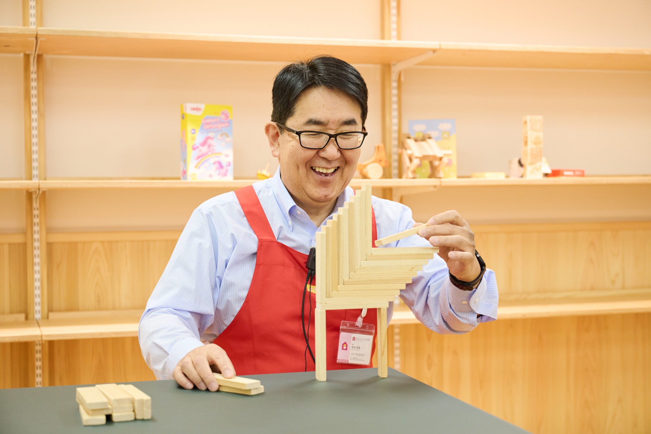 保育・教育事業と障がい福祉事業に取り組む私たちの法人の知見やノウハウを活かし、おもちゃ美術館としては初となる、障がいのある方も働けるインクルージョンな「おもちゃ美術館」として運営しています。その一例として当館の「おもちゃのひろば」のステージで行われる「積み木倒し」では、私たちの法人が運営する障がいのある方の就労施設「レイモンドマネジメント」の利用者の方に積み木の組み立てなどのイベント準備を行っていただいています。