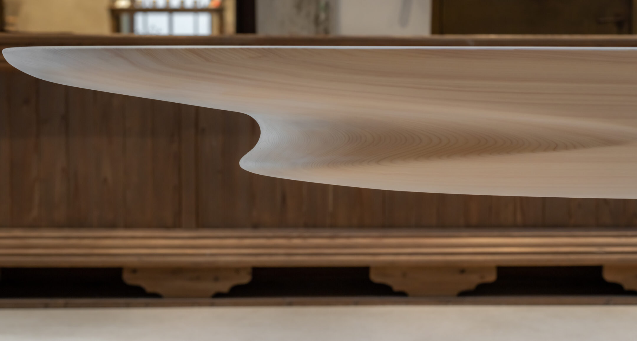 僕らが最初に取り組んだのは、展示会で吉野材のサンプルを紹介する方法ではなくて、吉野材でしか表現できない美しさを、オブジェとして見せることでした。そこで、一本の吉野桧の丸太から削り出した、長さ7mのカウンターをつくり、当時注目されていたパリの日本食レストラン「OGATA Paris」で展示させてもらい、デザイナーや建築家、メディア関係者を招いてイベントを開きました。