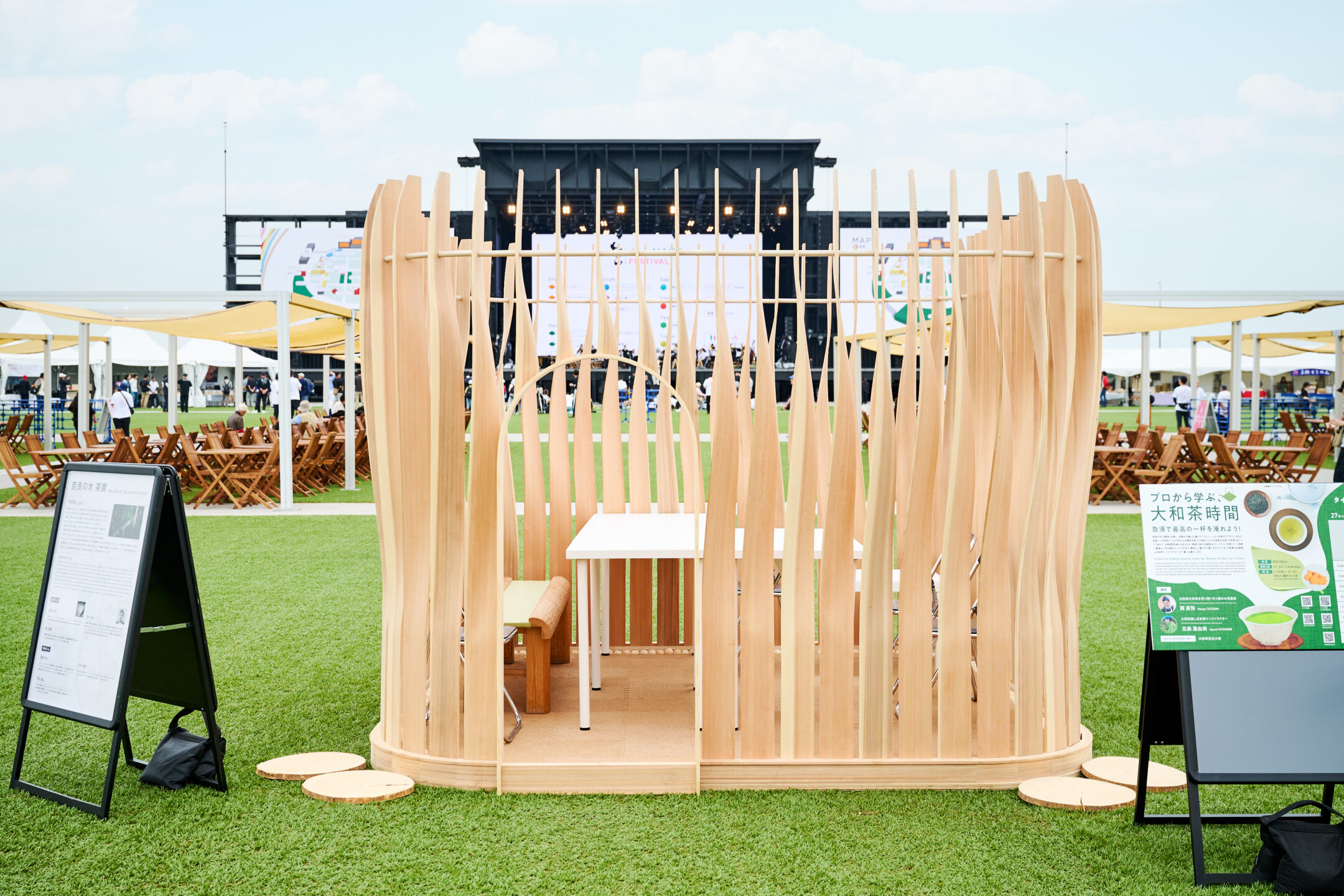 多くの来場者で賑わう会場内を進んでいくと、木目の美しい建物が。今回のイベントのために特別に造られた移動式茶室『寧楽庵(ねいらくあん)』です。