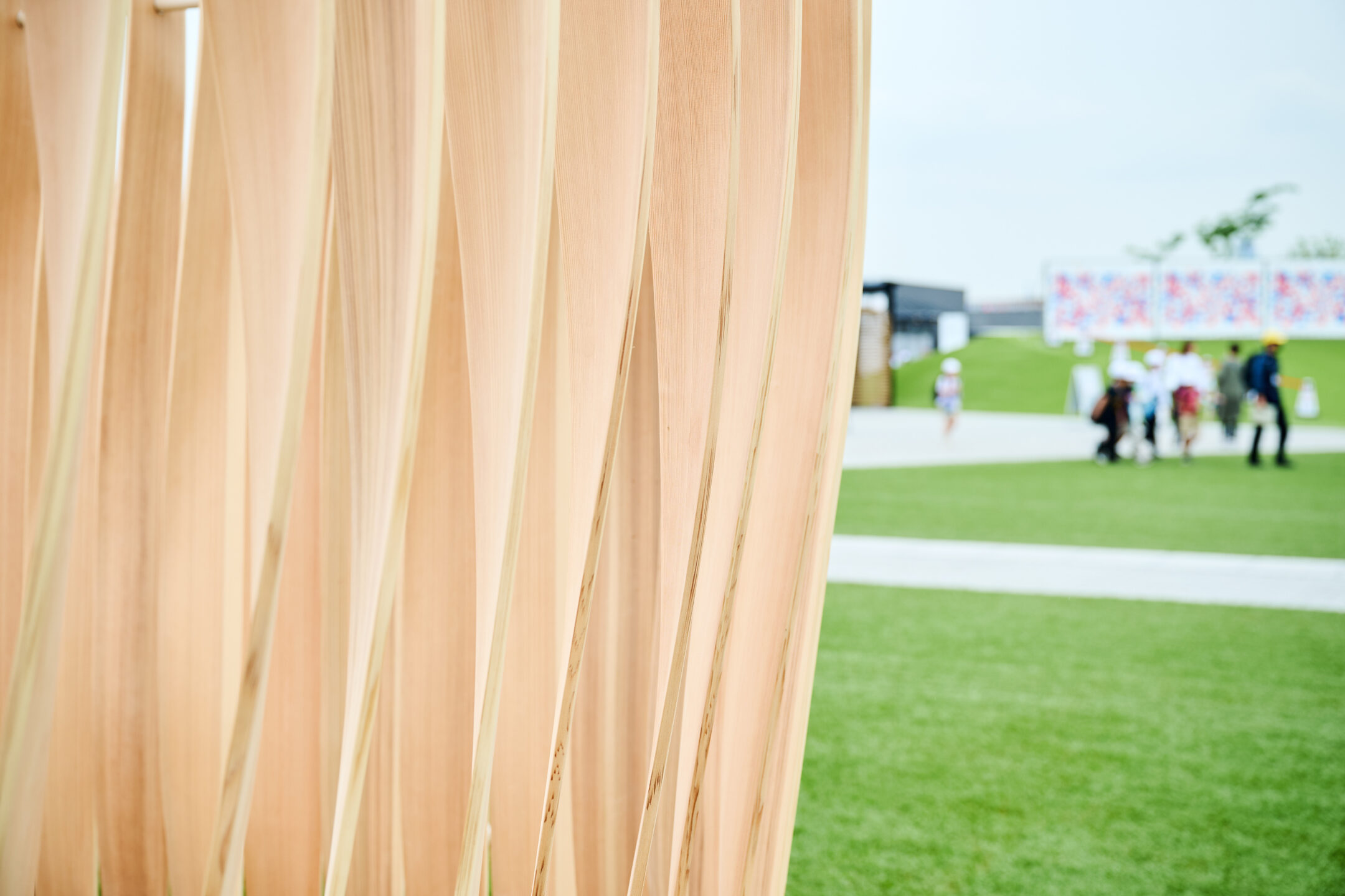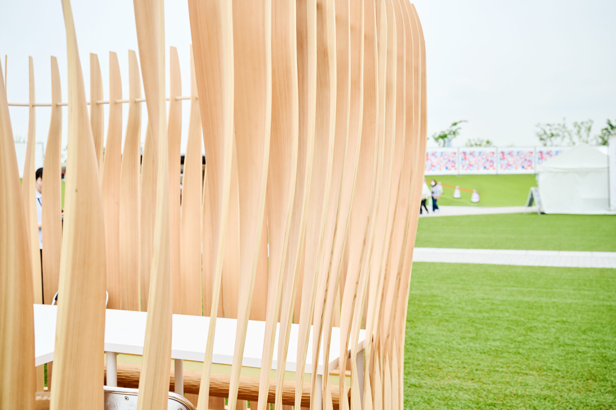 万博会場の雑踏のなかでは、外界の音を完全に遮断することはできない。だったら、視覚をコントロールして、茶室として求められる機能を表現できる仕掛けを作ってみようと考えました。突板をねじって配置することで、立っている人の視線は隙間を通り抜けますが、茶室のなかに座ると、板が自分と平行に並び、視界が遮られ、外界から守られているような状態になります。