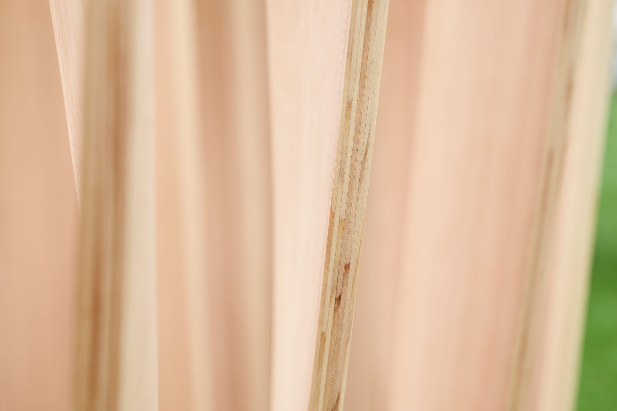 私はアイルランドで木工を学んでいた頃、木材を三次曲線に曲げる「Free Form Lamination」という技術を習得しました。ただ正直、帰国してからその技術を活かして作品を制作することは難しいだろうと思っていたんです。というのも、アイルランドで曲木の材料に使われていた木材は主に広葉樹で、突板に加工できるほどの品質を持った広葉樹はかなり希少なもので、高価なものです。そのため、身に付けた技術を活用できる材料が日本では手に入らない、たとえ活用できても部分的だろうと考えていました。それが、吉野地域に来てみたら、人工林で育てられた吉野杉が、突板に加工するのに理想的な品質を持っていて、しかもそれが安定供給されていることに驚きました。曲木にこんなに適した材料が山積みになっている光景を見て、「これならできる」と感じました。