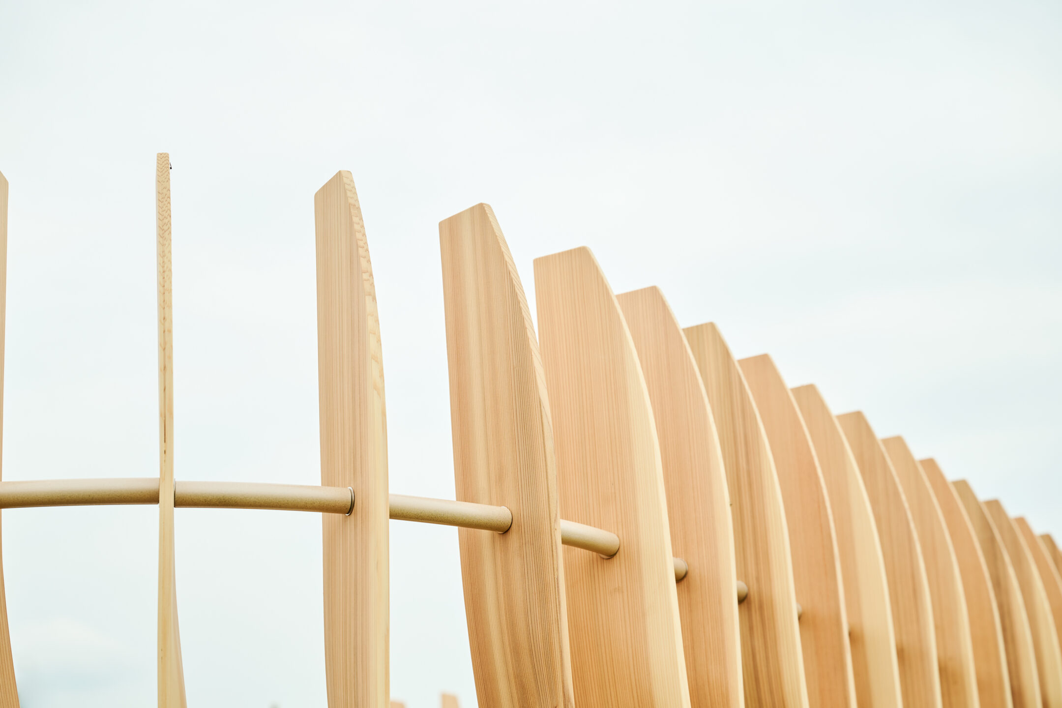ひとつひとつはシンプルな曲木(まげき)の集合体なのですが、それを規則的に配置することによって全く見え方が違う。一つの部材からは想像できないのですが、複数が組み合わさることで表現できる幅が広がることを学ばせてもらい、非常に良い経験をさせていただきました。