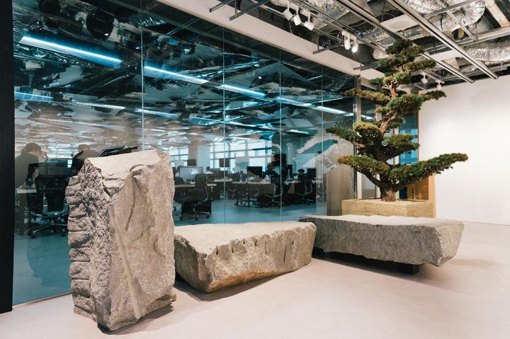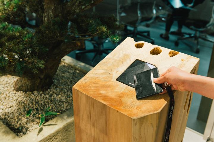 佐野:例えば、無垢の吉野ヒノキの天板のデスクを社員みんなが使っているオフィスは、おそらくここしかないと思います。また、受付のiPadを置くために使っている石は香川産の庵治石(あじいし)で1tもの重さがあって、ベンチに使用している石もそれぞれ1t以上ある。過剰だけど、素材の存在感や特徴がそのままに感じられるものがオフィスに置かれているのは面白いんじゃないかと考えました。
