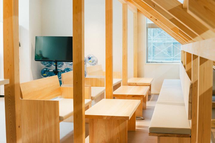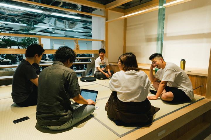 竹内:社員の反応で面白いのは、こちらが使用方法を指定しなくても、使っていくなかで様々な使用方法が生まれていくことですね。モニターが丸太に刺さっていたり、オフィスの壁一面がホワイトボードになっていたり、茶室があったりと、色々と違和感のあるスペースなので、引っ越してきたばかりの頃はみんな戸惑っている様子でした。最初はみんな自分の席で働いていたんですけど、少しずつ慣れてくると茶室でミーティングをしたり、階段に座って話し合ったりするようになっていく。今では、かなり自由度高く使いこなしていますね。柔軟な思考のメンバーが多いということもあって、自由に考えながらオフィスを活用している印象があります。